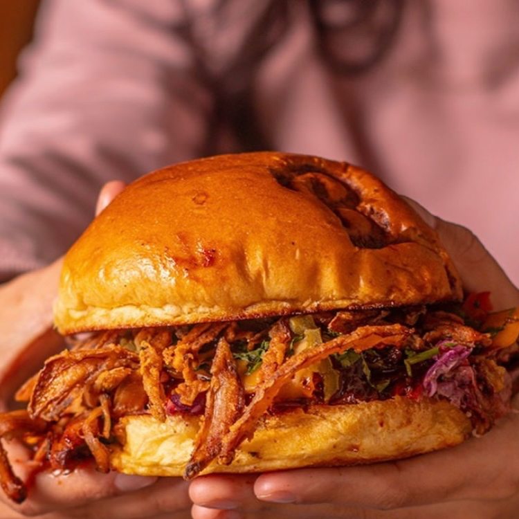 Incluye papas a la francesa) pan brioche, pulled pork bañado en salsa bbq, queso amarillo, cebolla frita y jalapeño en escabeche.