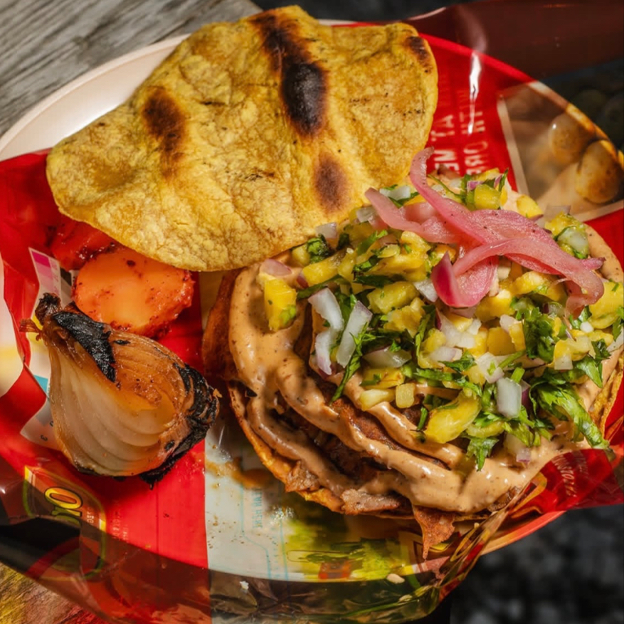 Tostada de mais, frijoles refritos, pastor, costra de queso, mayochipotle y picadura de piña, cebolla morada y cilantro. (incluye cebolla asada bañada en clamato y papa galeana adobada)