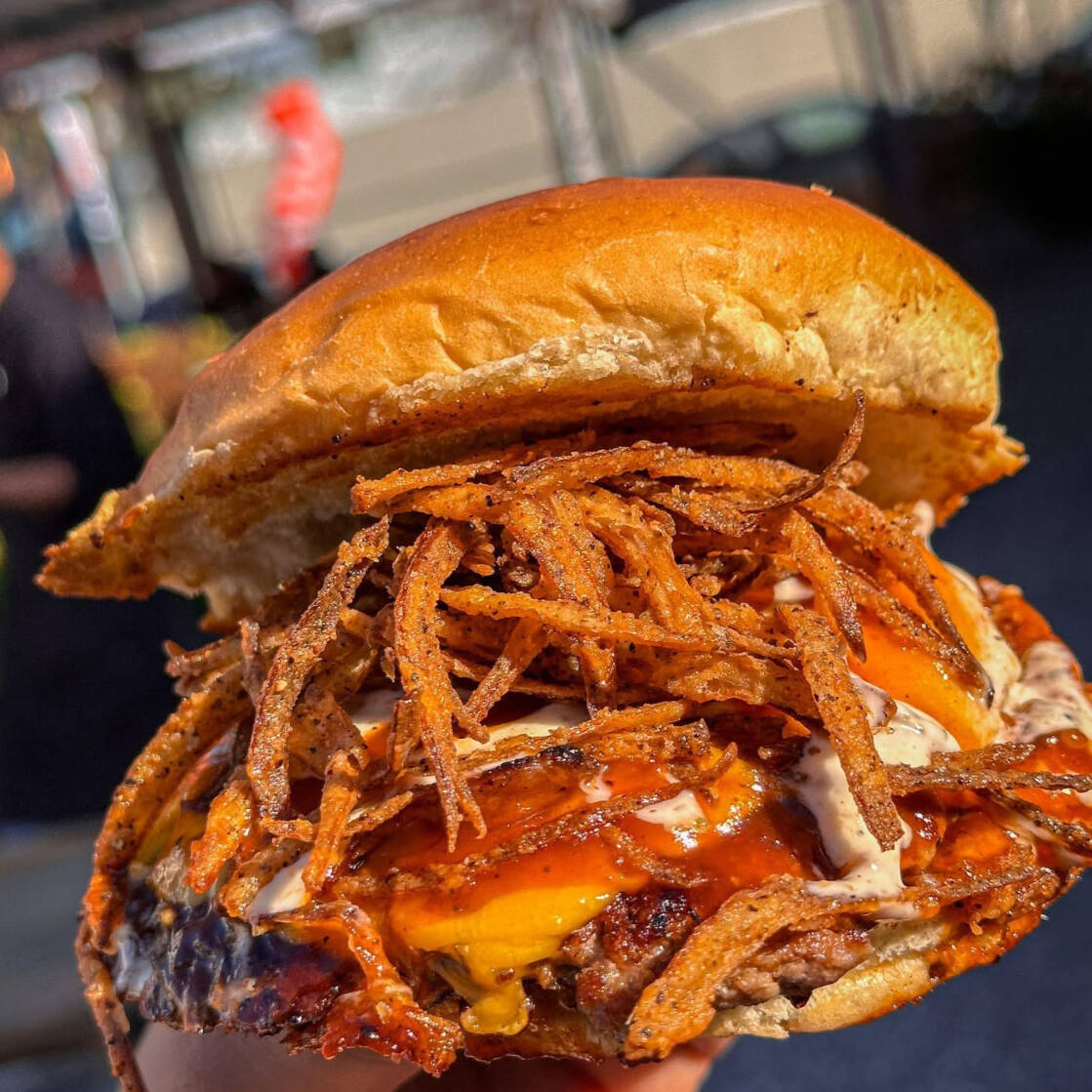 Incluye papas a la francesa) pan brioche,pure de papa, carne de res, queso amarillo, tocino hecho en casa, salsa bbq, ranch y cebolla frita.