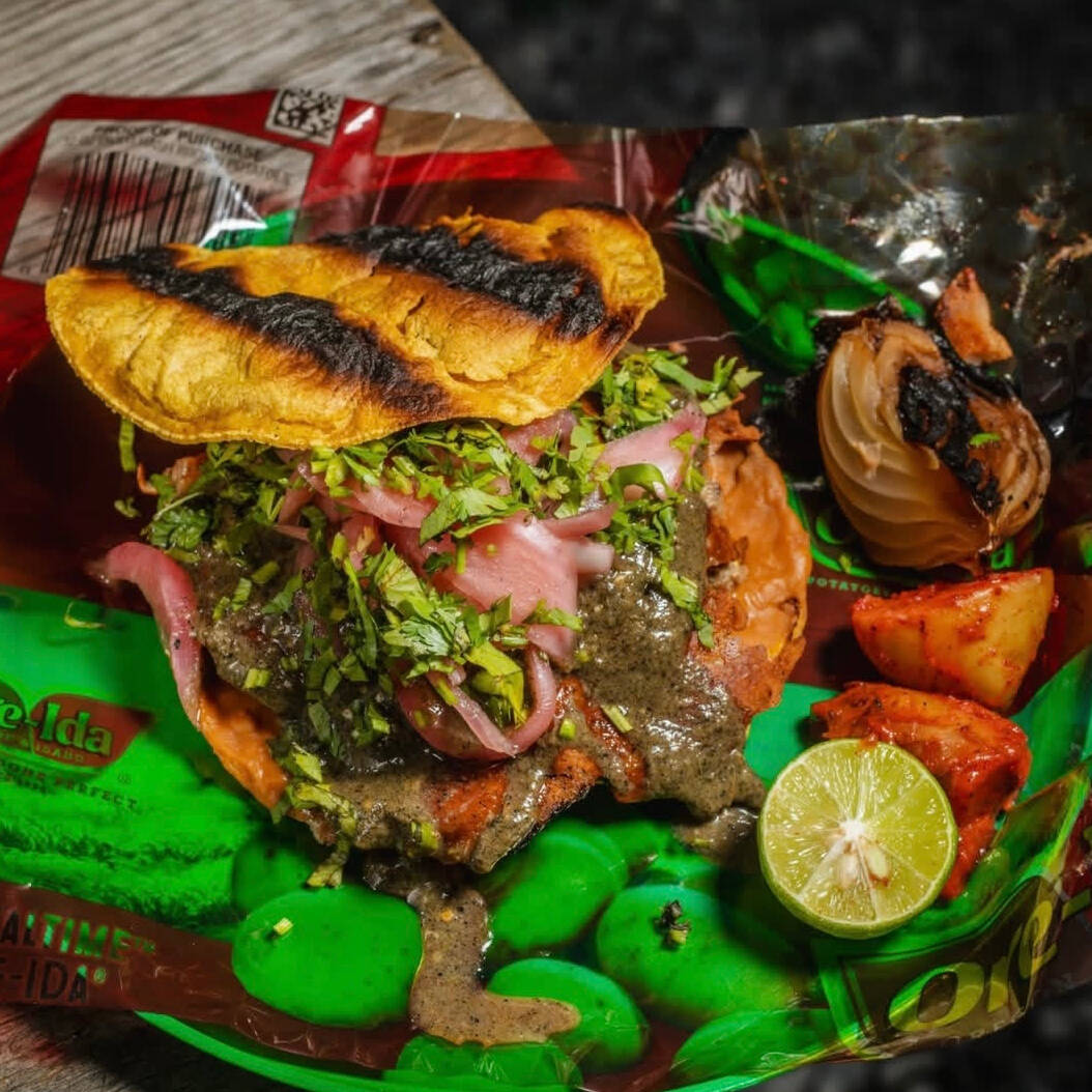 Tortilla grande de maíz amarillo, queso mty jack, carne de pastor, acompañado de guacamole estilo tijuana, cebolla y cilantro picado. (incluye cebolla asada bañada en clamato y papa galeana adobada)