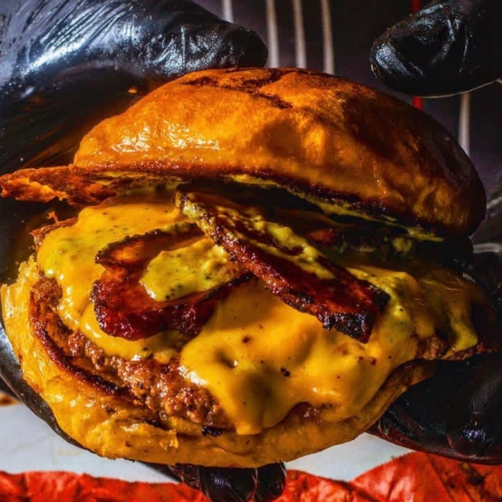 Incluye papas a la francesa) pan de papa, carne de res, mayonesa a base de pepinillos, doble queso amarillo y doble tocino hecho en casa.