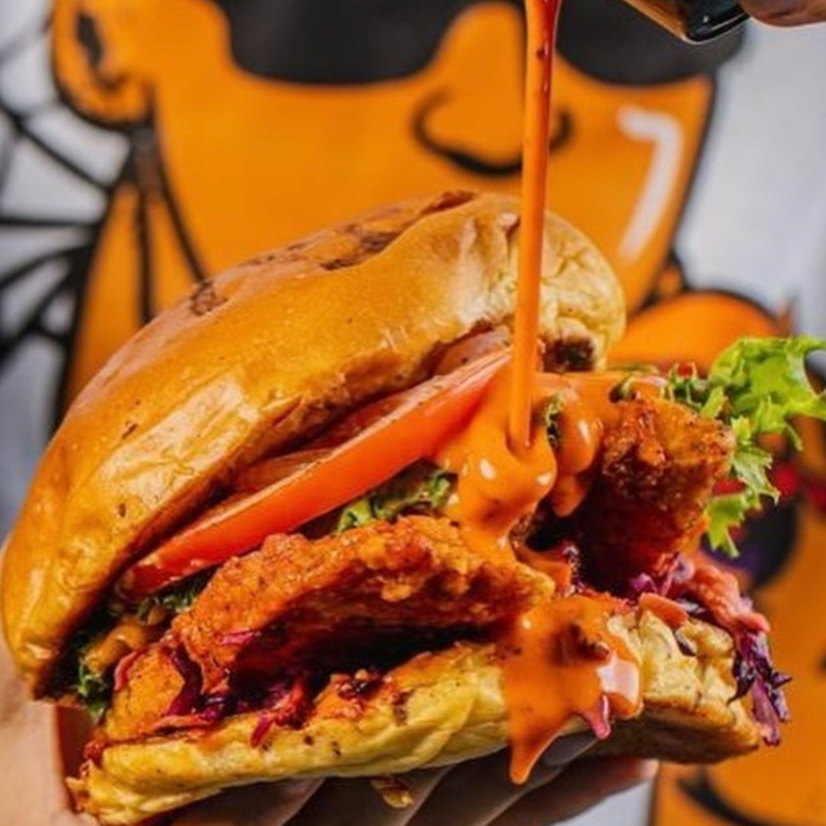 Incluye papas a la francesa) pan brioche, pechuga de pollo en receta crujiente o a la plancha, bañado en bbq o buffalo, queso amarillo, lechuga, tomate y ranch.