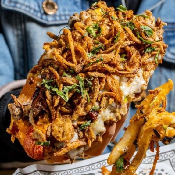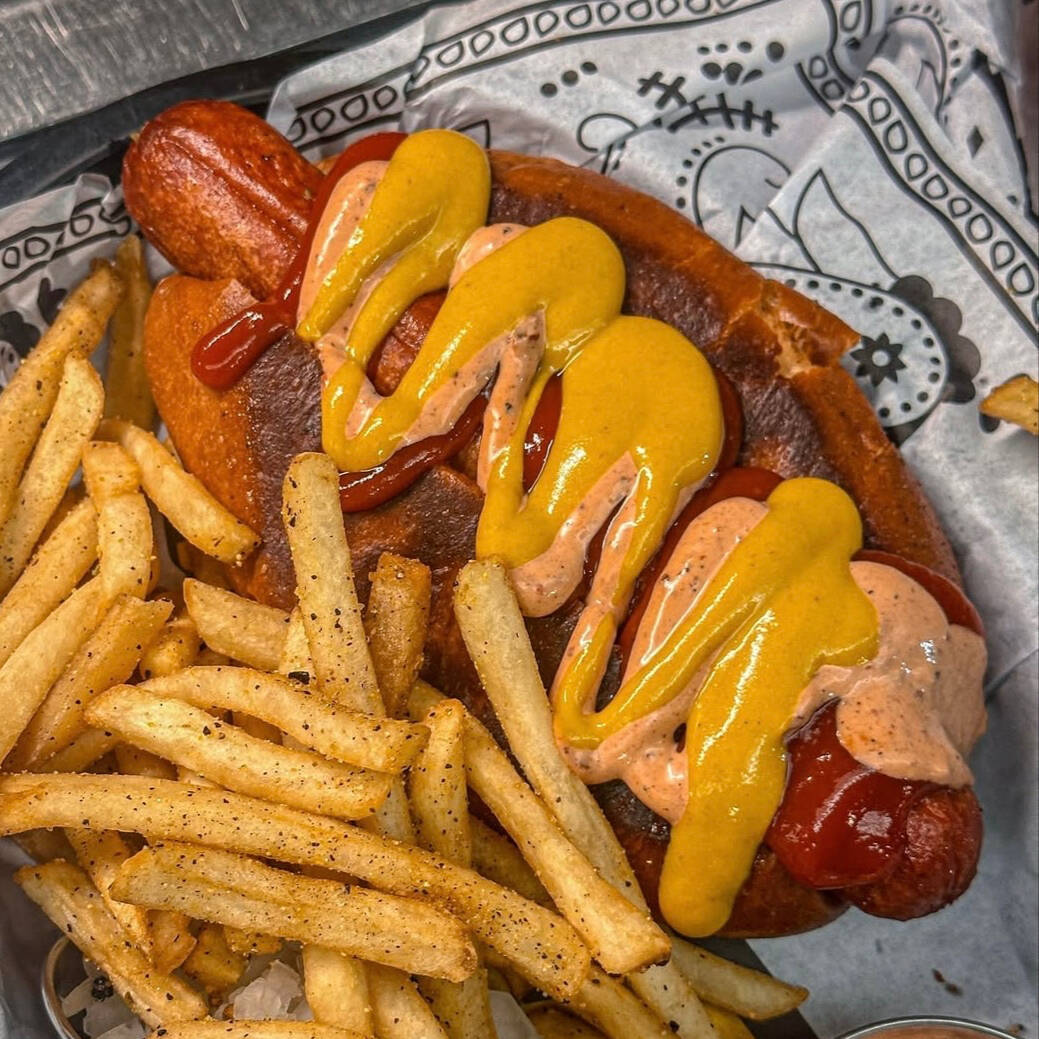 Incluye papas a la francesa) pan brioche, salchicha de res, carne asada, queso rallado mty jack, cebolla empanizada, mostaza, ketchup y mayopchipotle.