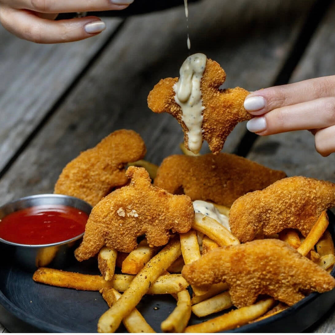 Nuggets de pollo empanizado, acompañados de papas a la francesa, katsup y ranchitos