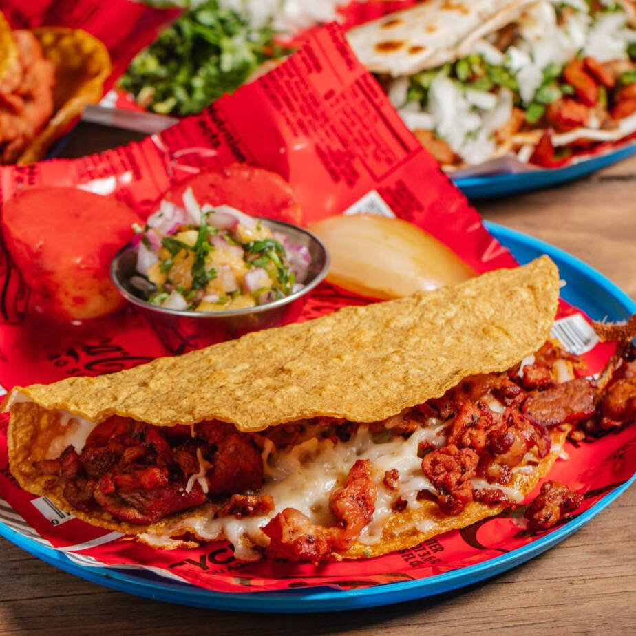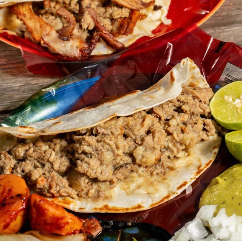 Tortilla de harina recién hecha, queso mty jack, pastor, acompañado de una picadura de piña, cebolla morada y cilantro, (incluye cebolla asada bañada en clamato y papa galeana adobada)
