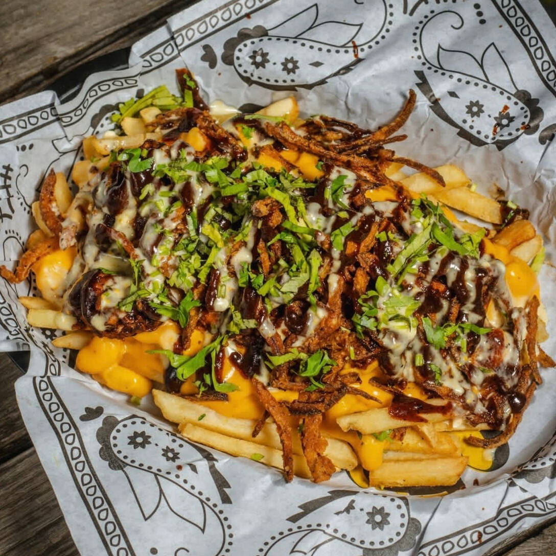 Una cama de papas a la francesa, bañadas en macarrones con queso, pulled pork bañado en bbq, cebolla frita, cilantro picado y ranch.