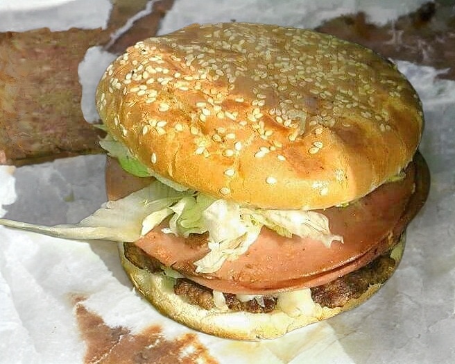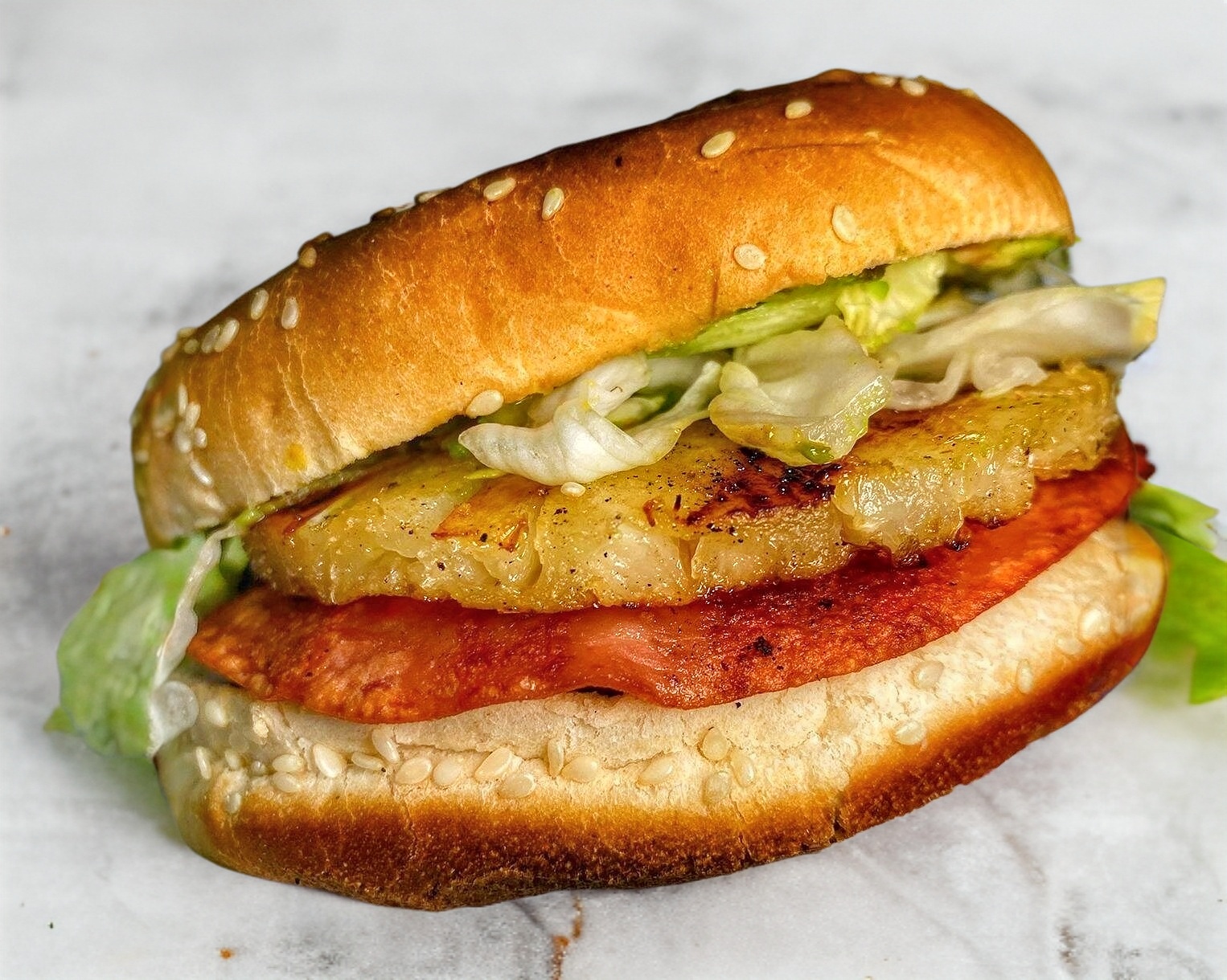1 Rebanada de piña, 1 carne 150 gr., queso jamón aguacate tomate lechuga y aderezos.