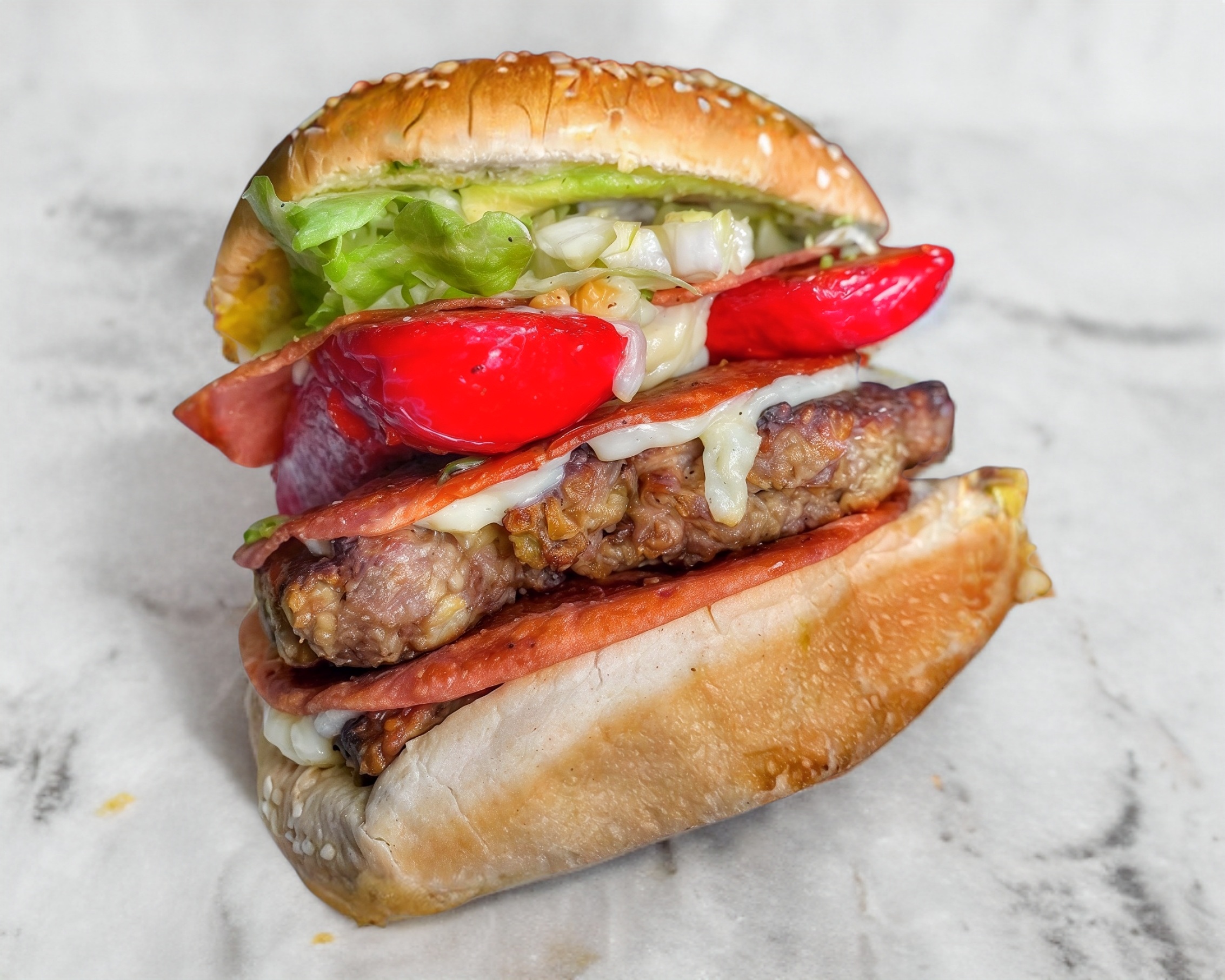 1 Carne 150 gr., 2 quesos 2 jamones aguacate tomate lechuga y aderezos.