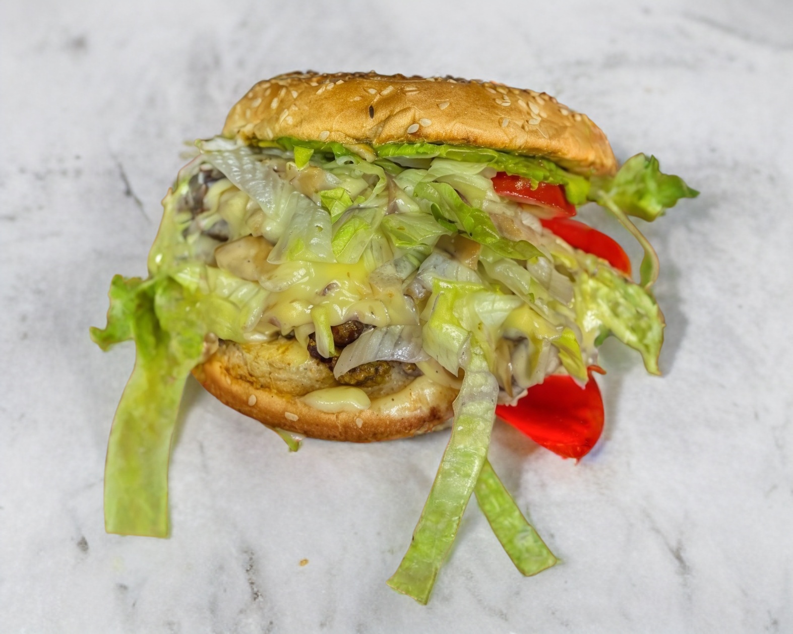 1 Carne 150 gr., champiñones, queso jamón aguacate tomate lechuga y aderezos.