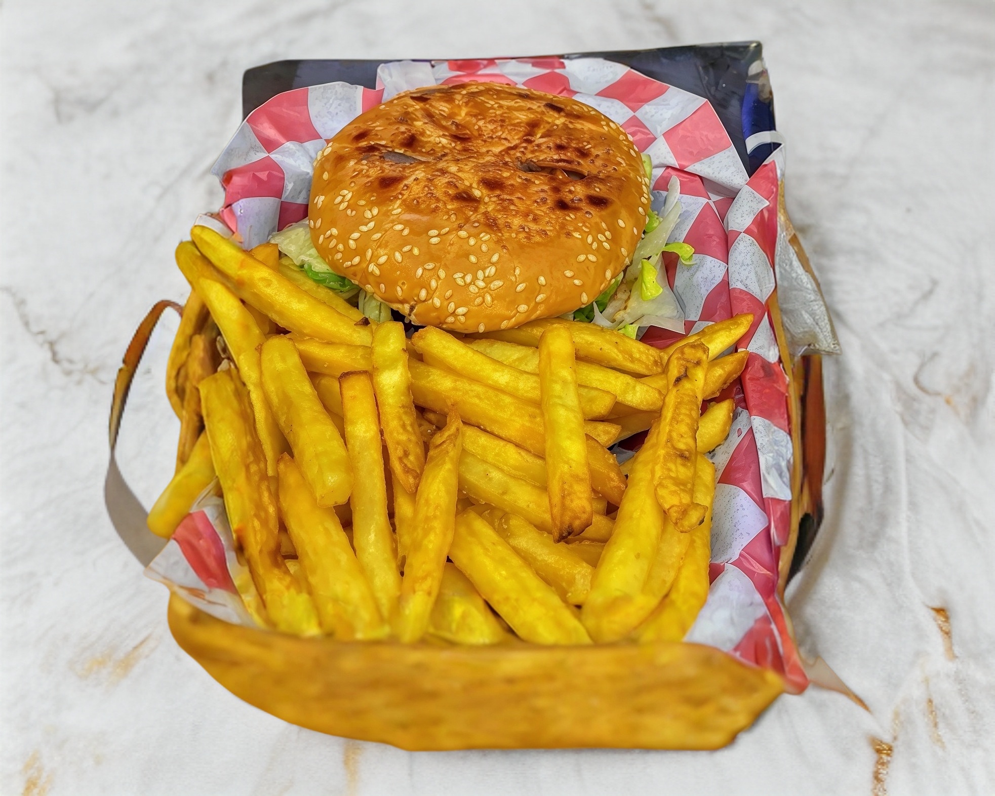1/2 Orden de papas, 1 carne 150 gr., 2 quesos 2 jamones aguacate tomate lechuga y aderezos.