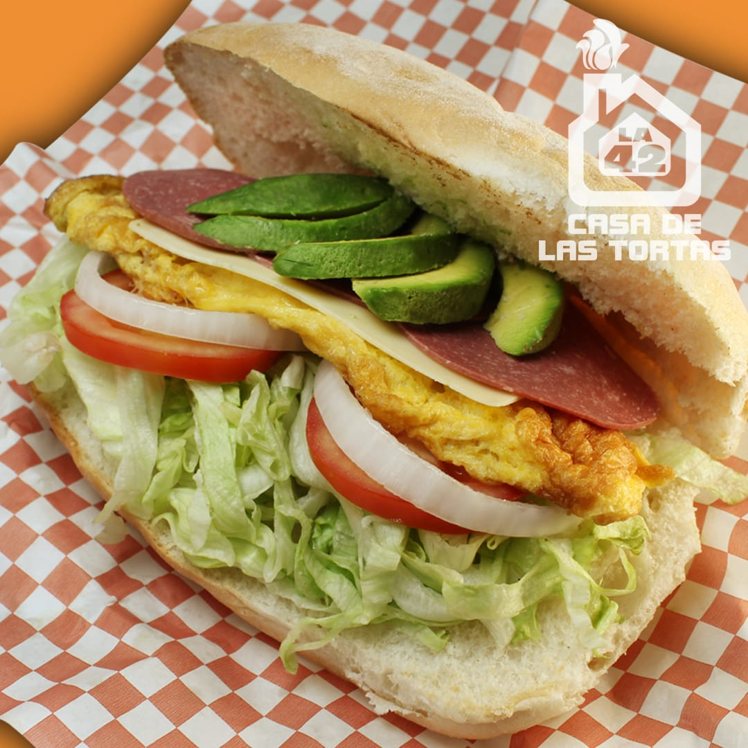 Huevo, chorizo y queso panela. Incluye lechuga, tomate, cebolla y mayonesa.
