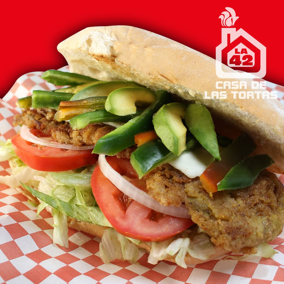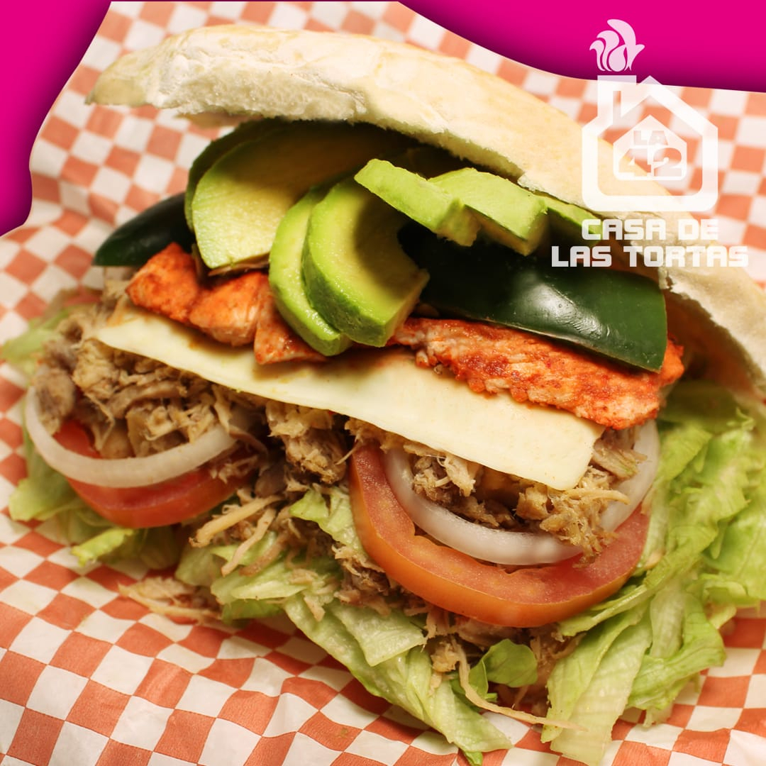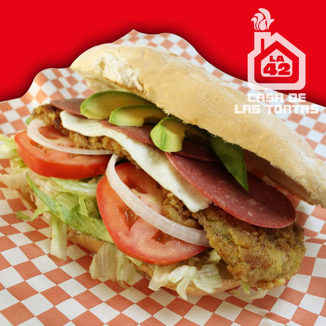TORTA POBLANA, MILANESA DE RES EMPANIZADA, QUESO PANELA,RAJAS DE CHILE TOREADO, LECHUGA, AGUACATE,CEBOLLA,TOMATE Y MAYONESA