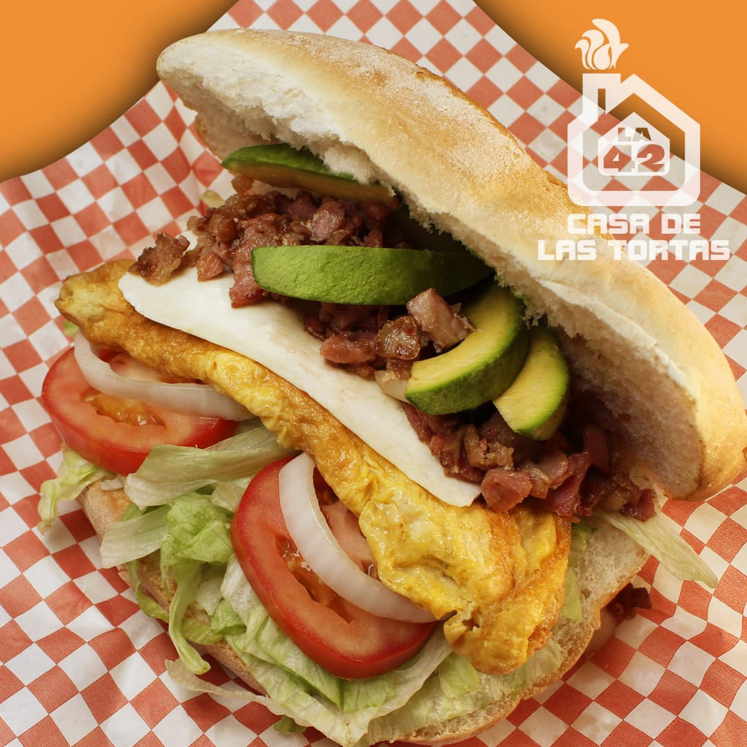 Huevo, salchicha y queso panela. Incluye lechuga, tomate, cebolla y mayonesa.