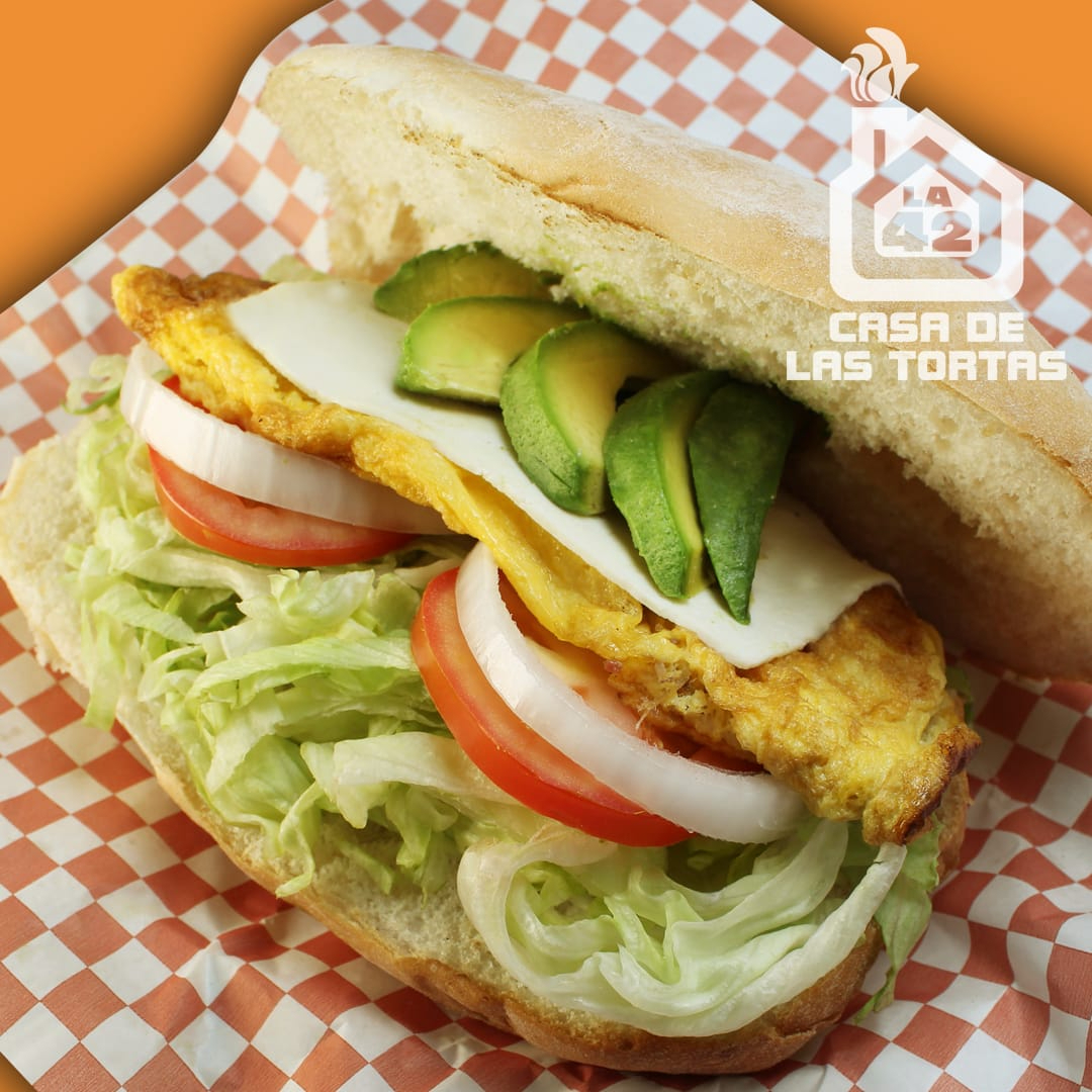 Huevo, rajas y queso panela. Incluye lechuga, tomate, cebolla y mayonesa.