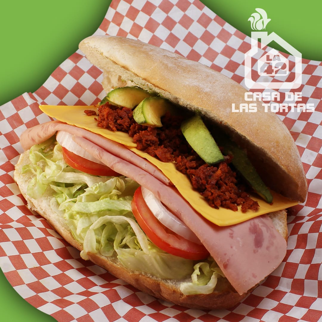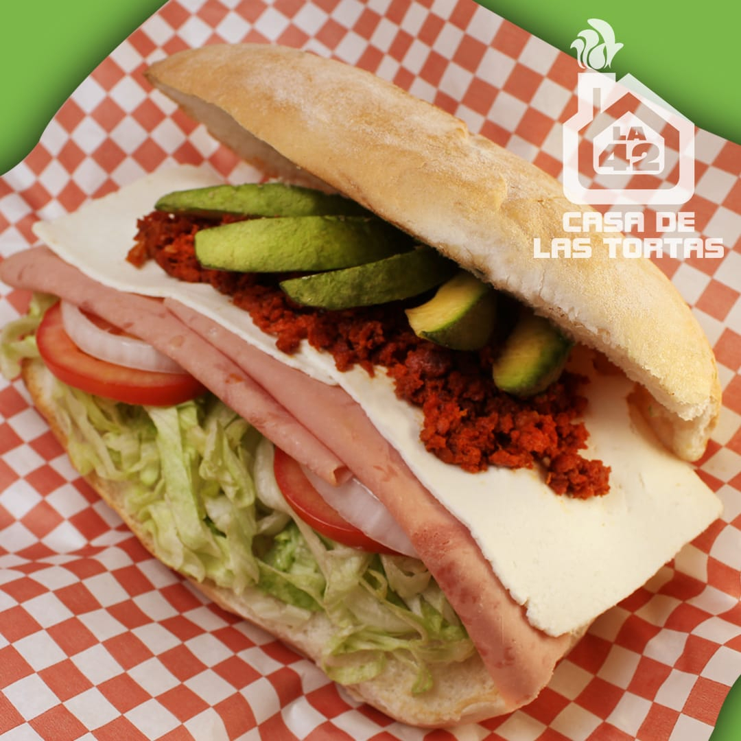 DOBLE porción llenadora de pierna con chorizo y queso panela. Incluye aguacate, lechuga, tomate, cebolla y mayonesa.
