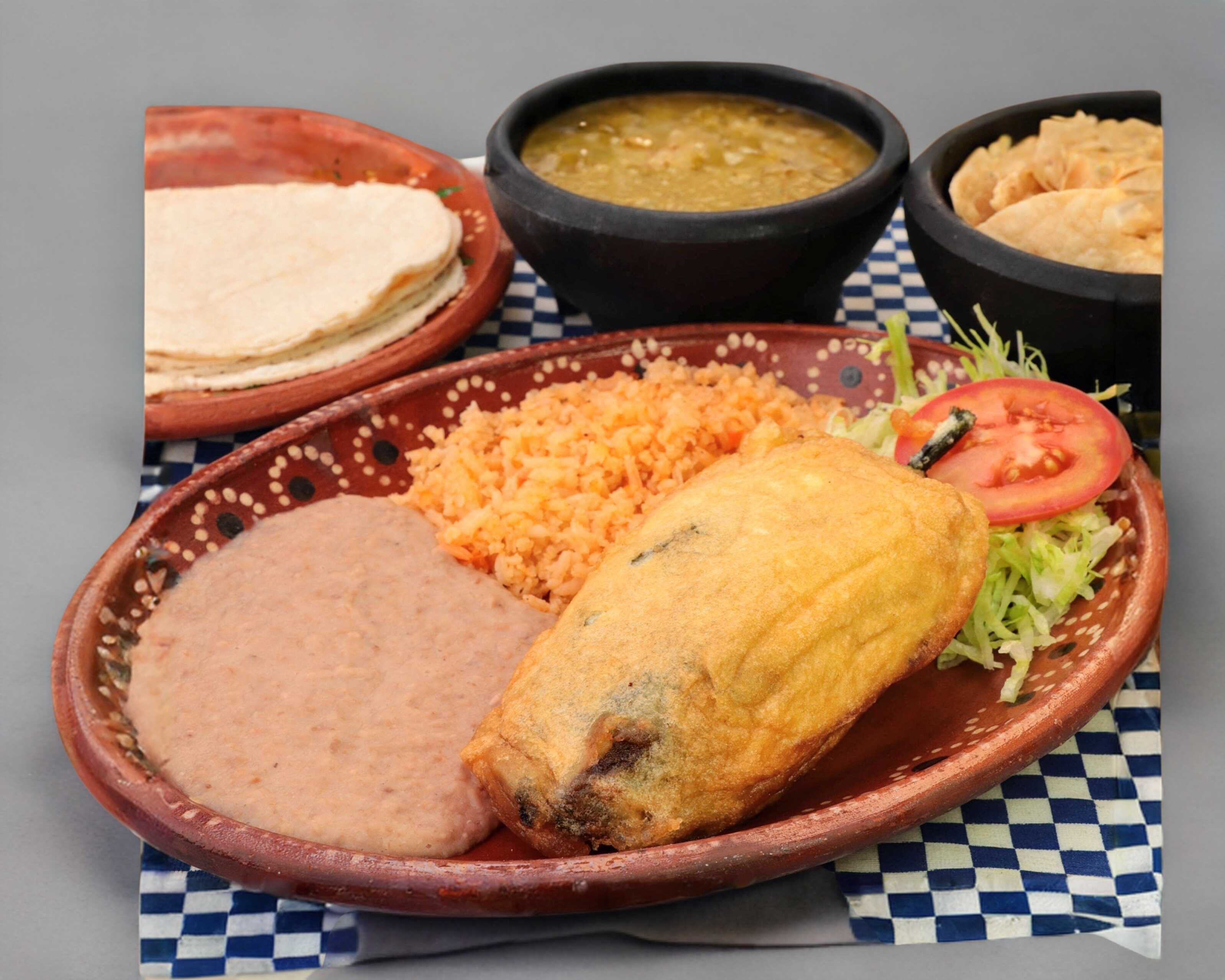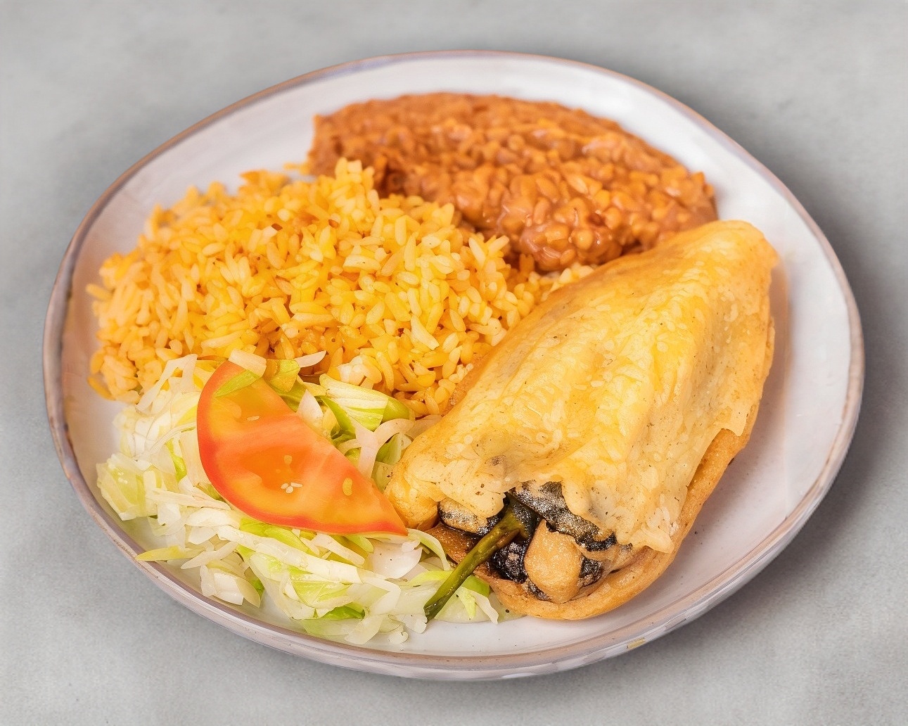 Chile poblano relleno de queso asadero lampreado acompañado de dos guarniciones a elegir.