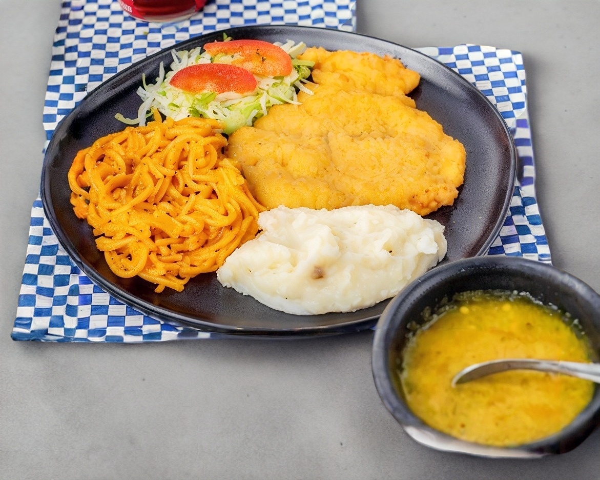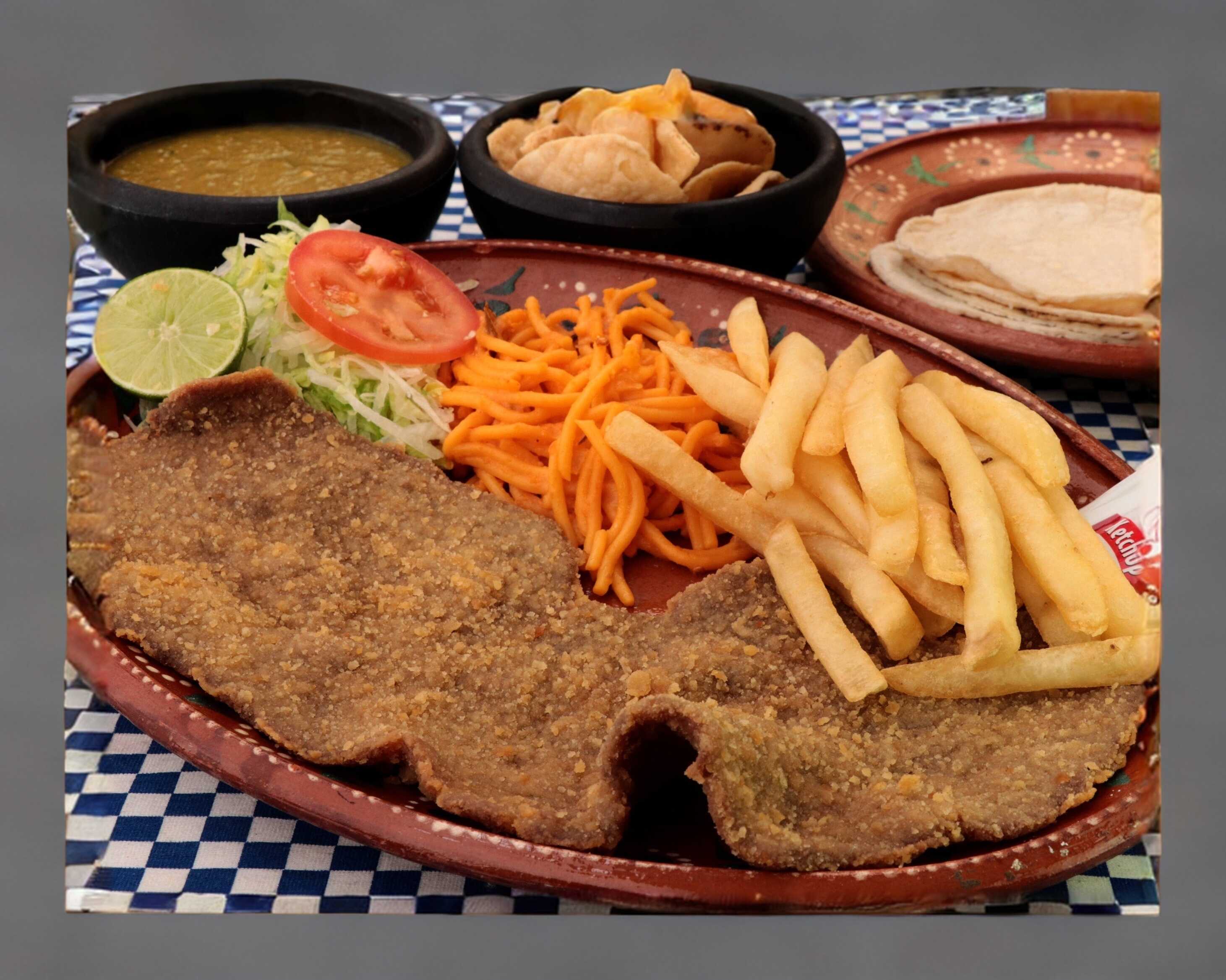 Platillo personal: Aproximadamente 170 g en crudo de pechuga de pollo empanizada, acompañada de dos guarniciones a elección, totopos, 4 tortillas y salsa verde. 🍗🌮✨