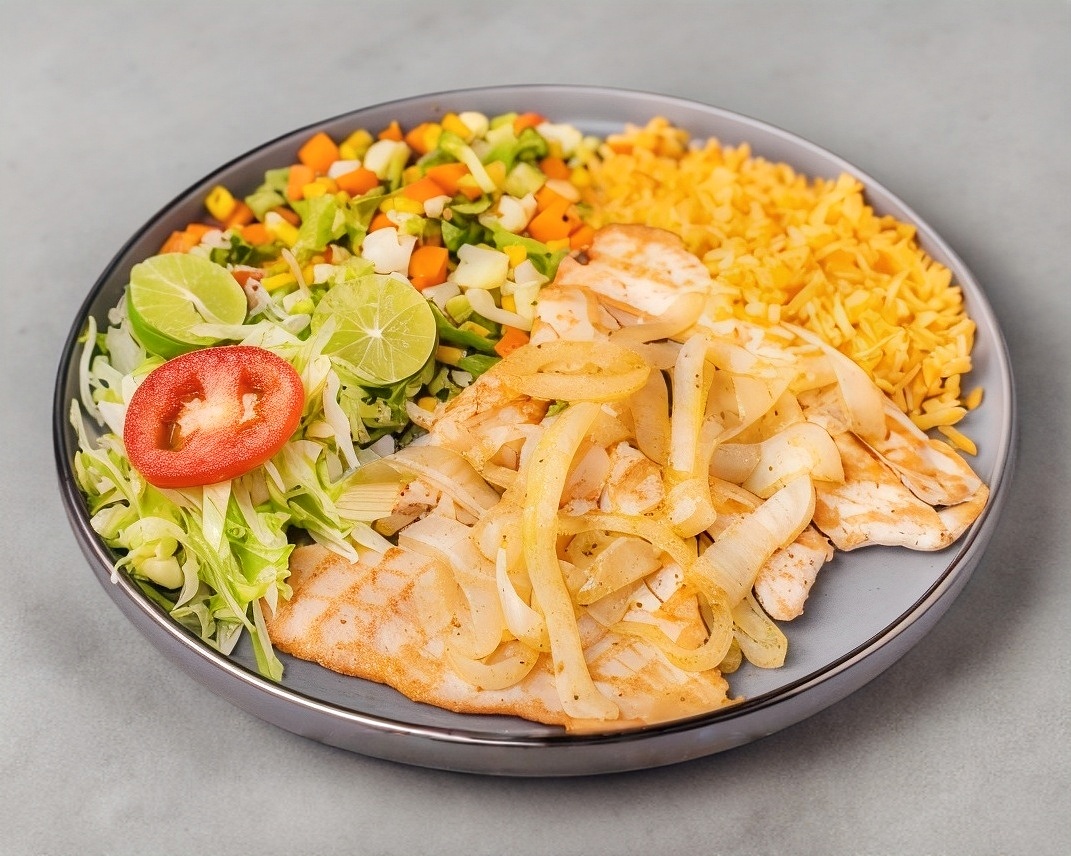 Filete de mojarra empanizado acompañado de dos guarniciones a elegir