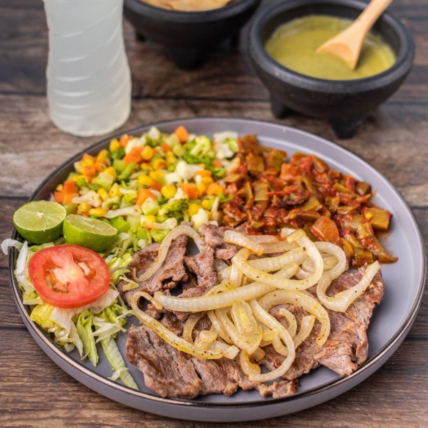 Arrachera encebollada con dos de tus guarniciones favoritas