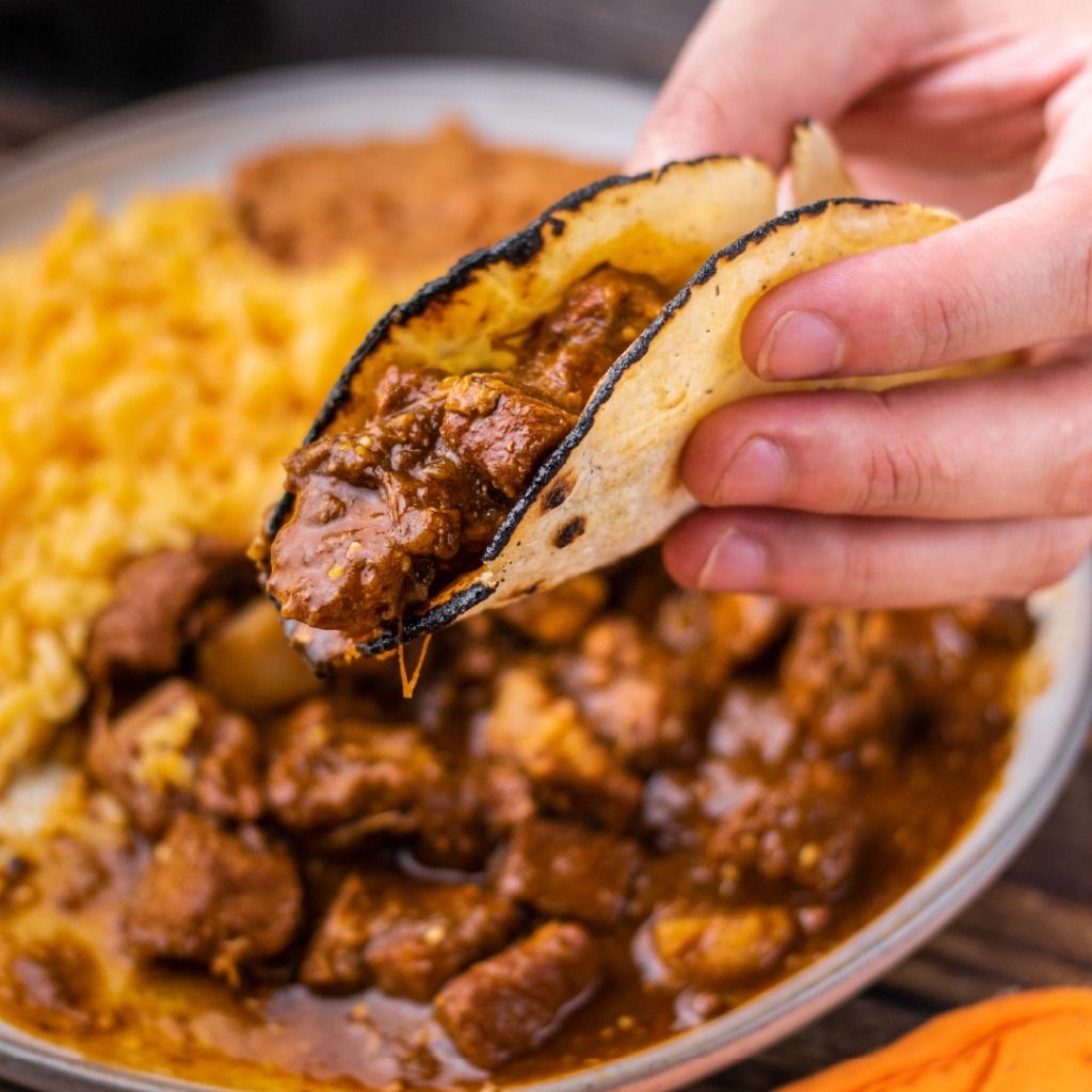 Asado de puerco con papá en salsa de chile pasilla.