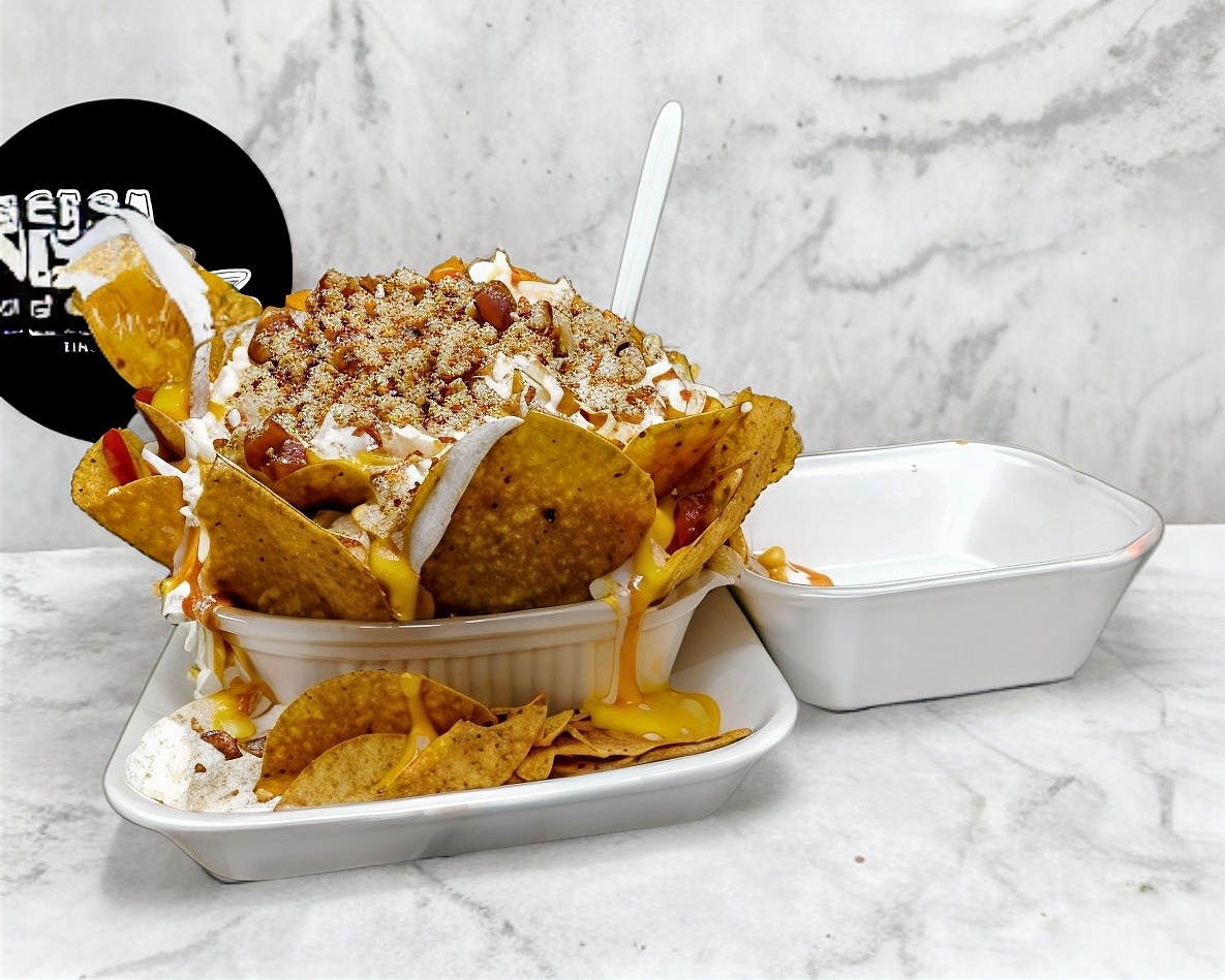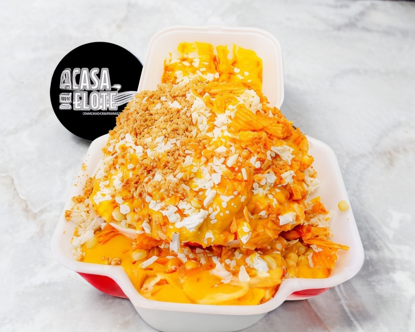 1 Kilo de elote desgranado y una bolsa de tostitos, con mantequilla derretida, mayonesa casera, chipotle casero, queso cheddar (amarillo), chile en especie (pica y no pica), queso blanco molido, ruffle molido, cacahuate molido.