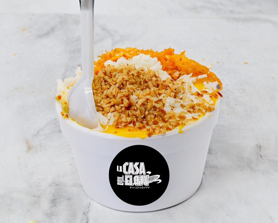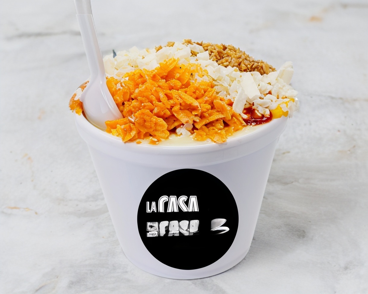 Elote desgranado con mantequilla derretida, mayonesa casera, chipotle casero, queso cheddar (amarillo), chile en especie (pica y no pica), queso blanco molido, ruffle molido, cacahuate molido.