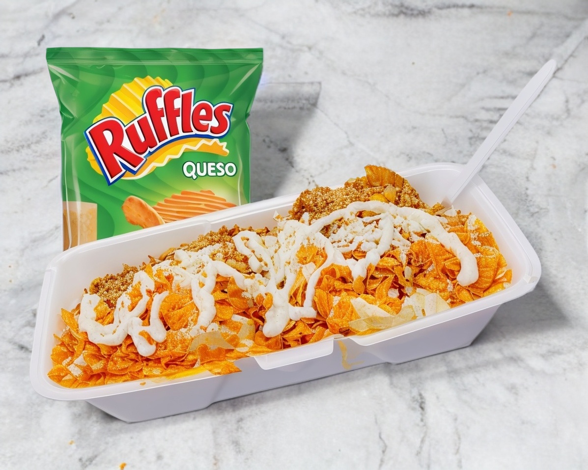 Bolsa de ruffles de 50 g con elote desgranado, con mantequilla derretida, mayonesa casera, chipotle casero, queso cheddar (amarillo), chile en especie (pica y no pica), queso blanco molido, ruffle molido, cacahuate molido.