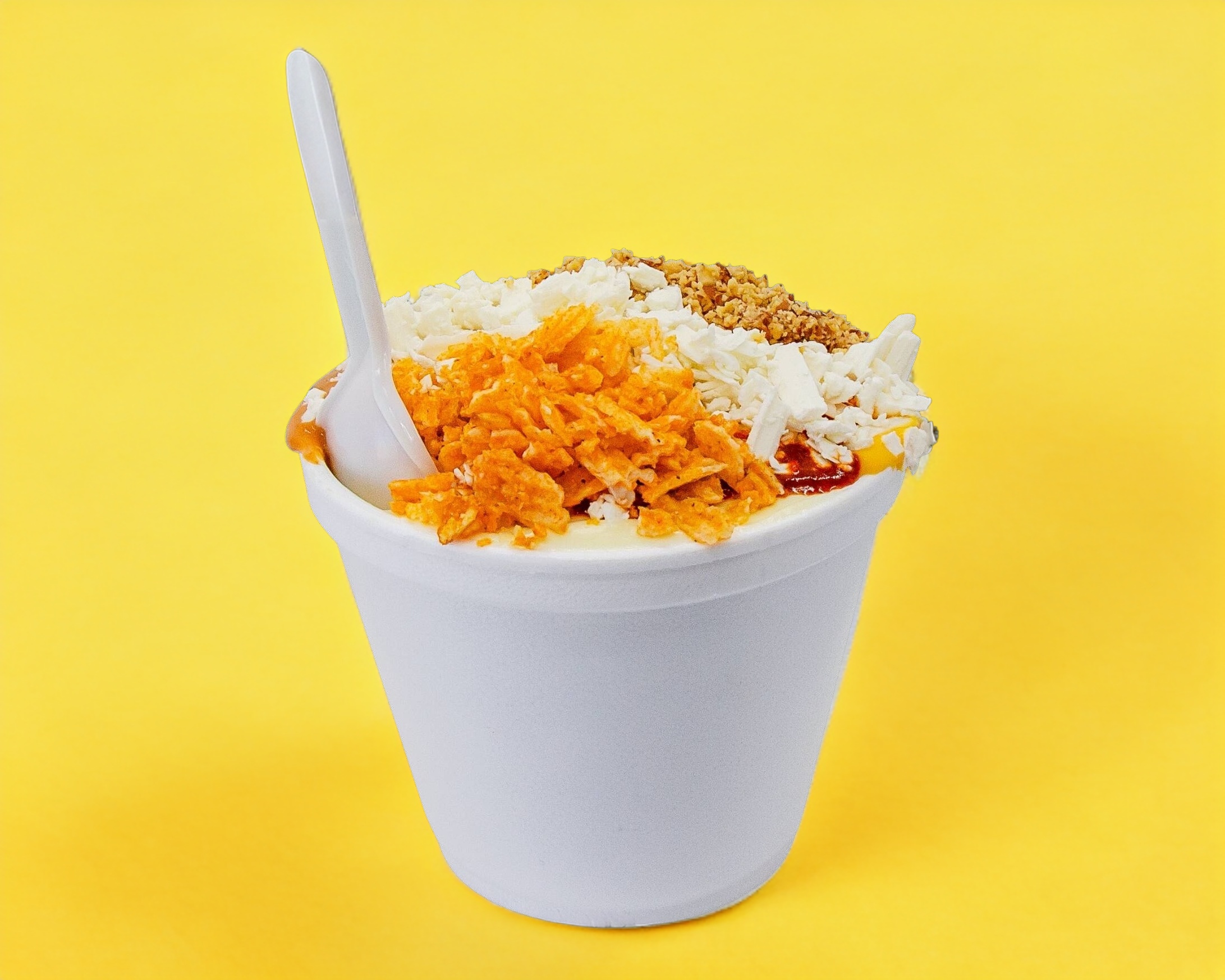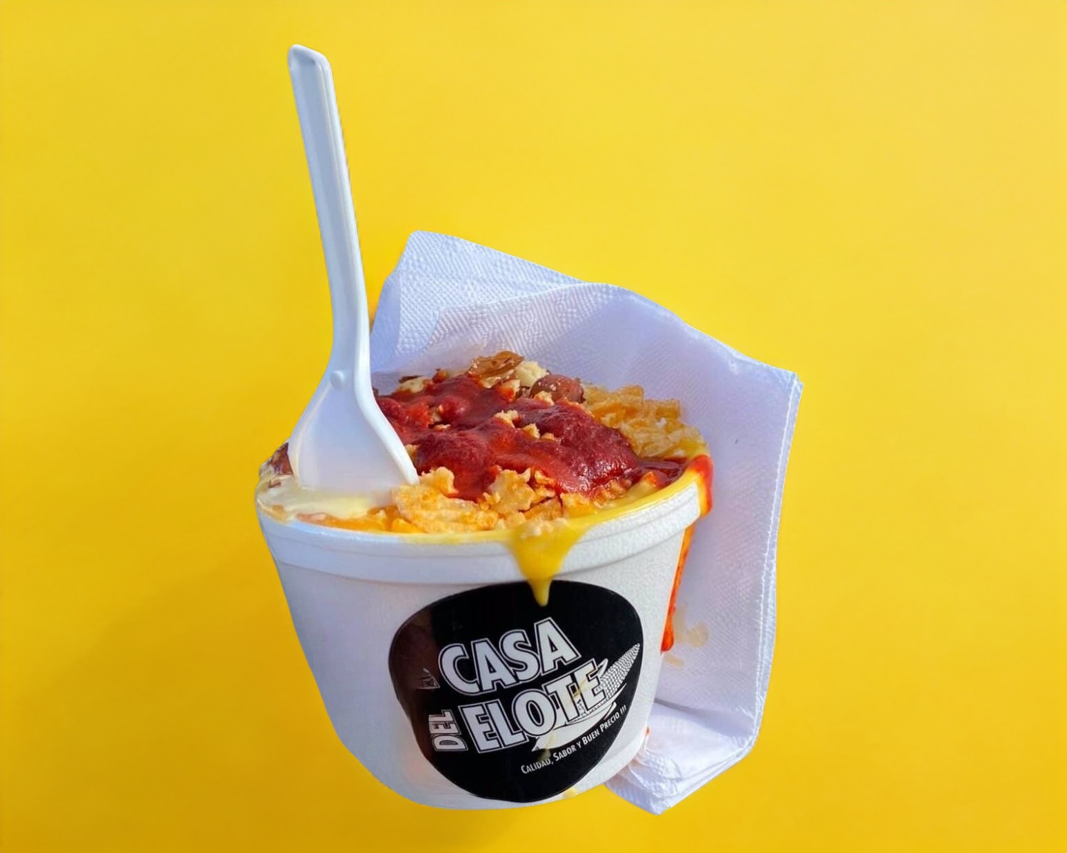 Elote blanco, mayonesa,queso amarillo cheddar,chipotle,queso blanco,cacahuate,ruffles, chile elote.