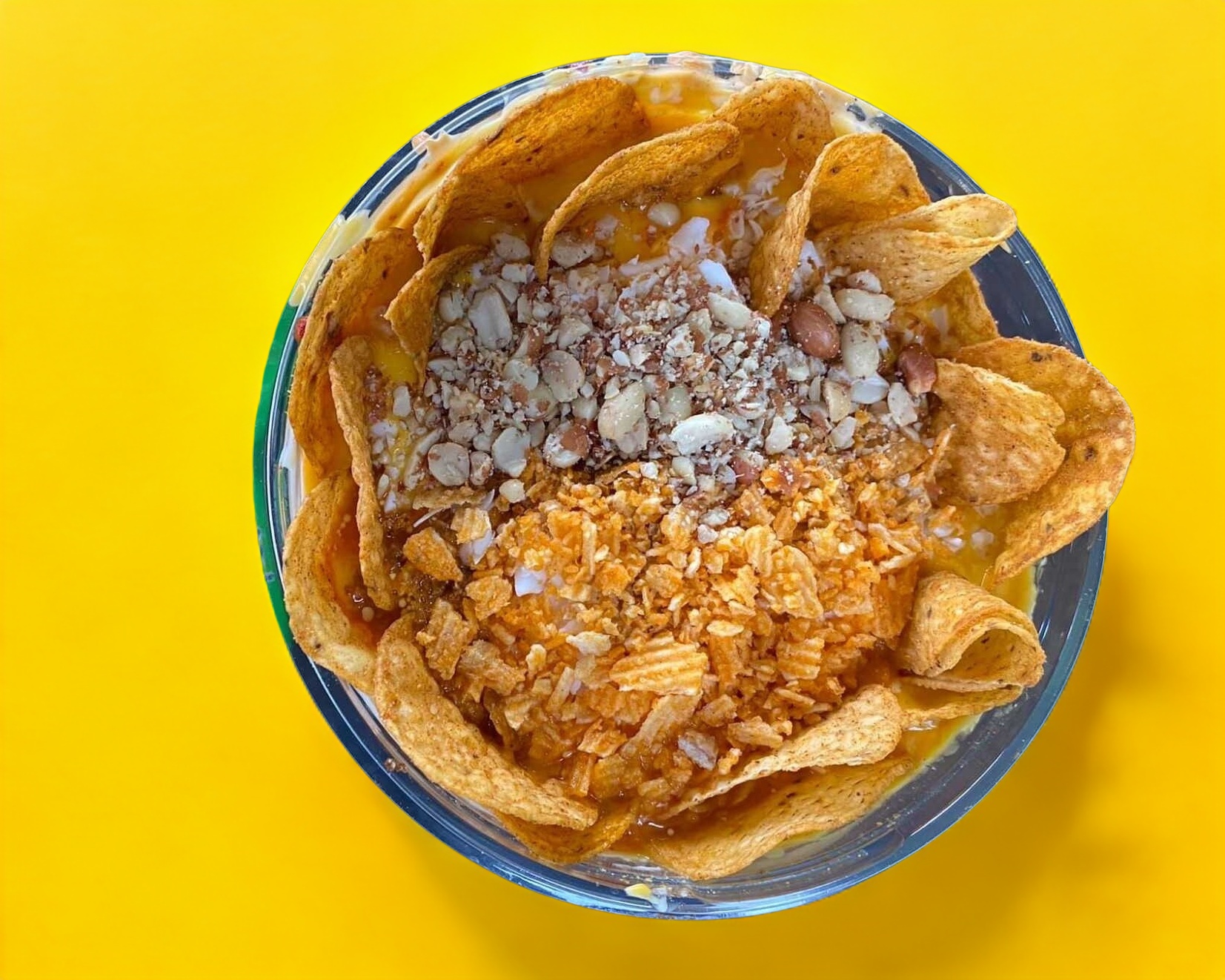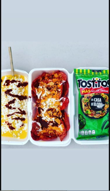 Tostitos verdes con elote, con mayonnesa,queso amarillo cheddar caliente,chipotle,chile,queso blanco,cacahuate y ruffles.