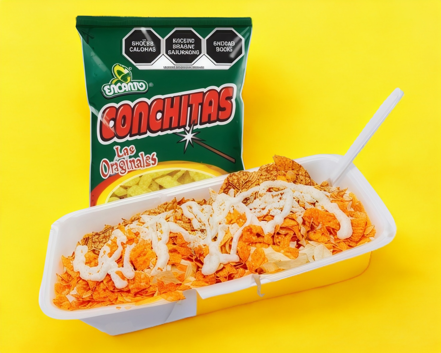 Conchitas con elote , con mayonnesa,queso amarillo cheddar caliente,chipotle,chile,queso blanco,cacahuate y ruffles.