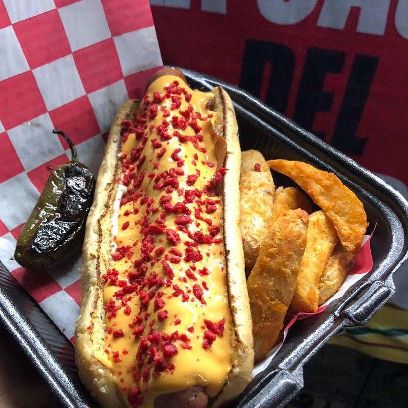 Salchicha polaca de 20 cm, tocino, bañado en queso cheddar y tocino deshidratado incluye papas