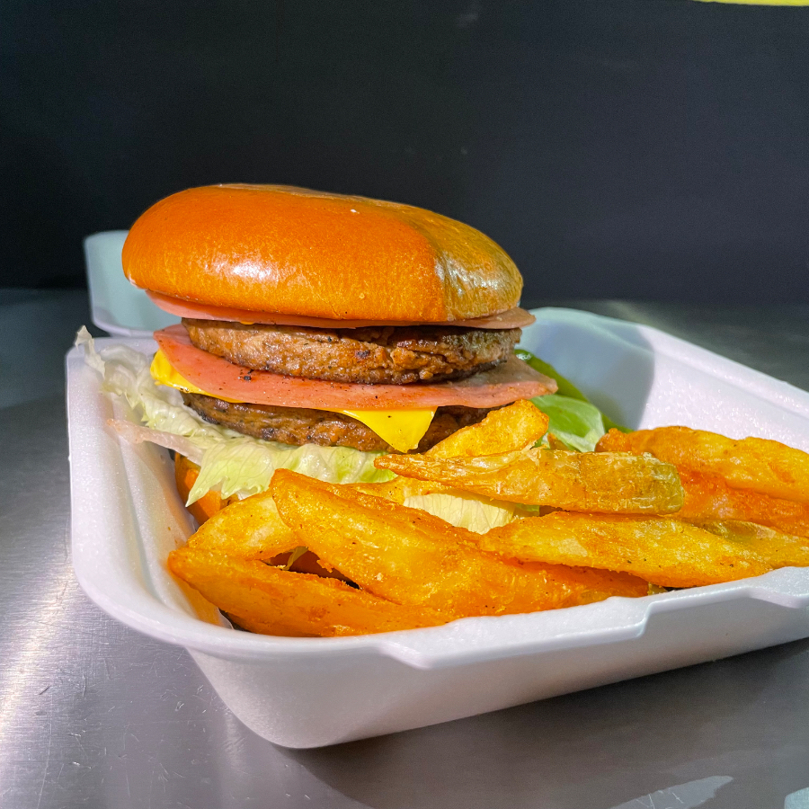 Carne 100% arrachera, doble jamón, doble queso americano, tocino, todo adentro de nuestro pan brioche con mayonesa y bañado en queso cheddar y tocino deshidratado