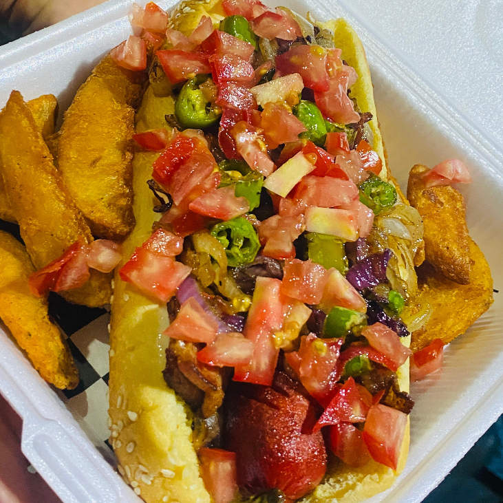 Salchicha polaca de 20 cm, tocino, cebolla caramelizada, tomate y chile serrano picadita, salsa chipotle ya incluye papas