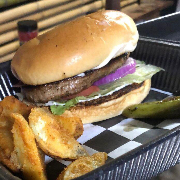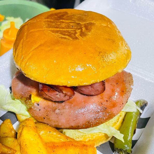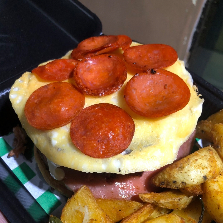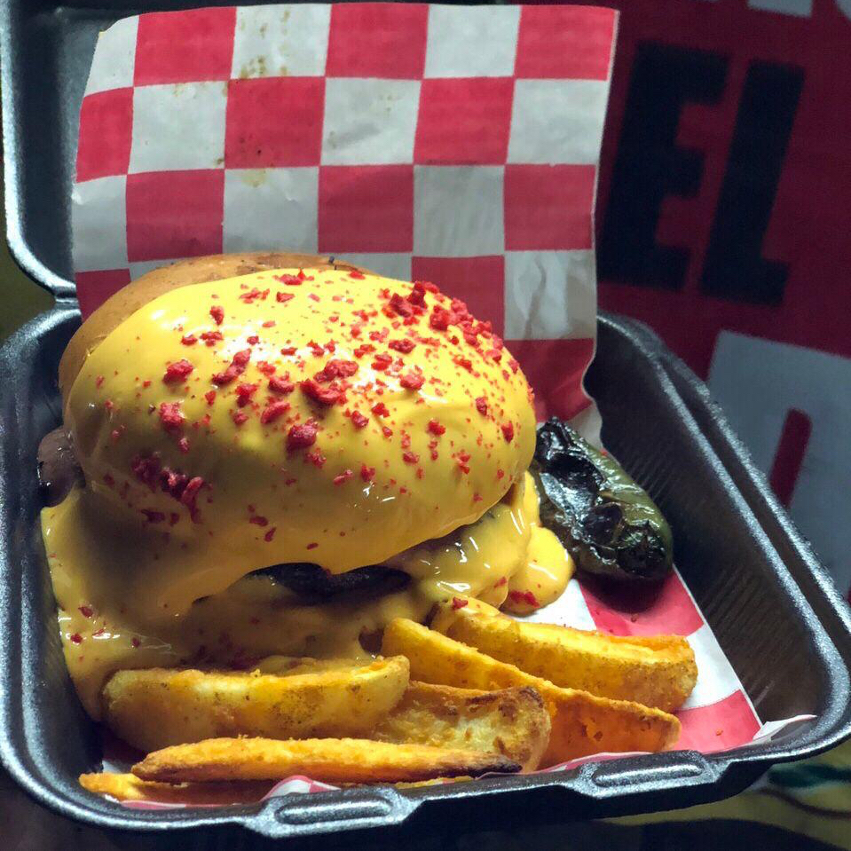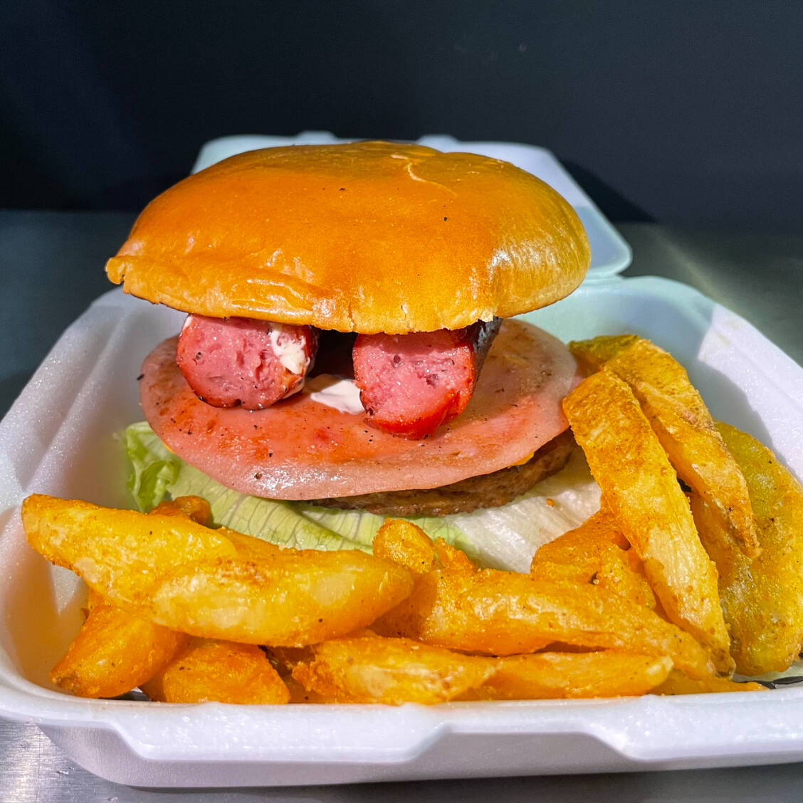 Carne 100% arrachera, jamón, queso americano, tocino, mayonesa, pan brioche, costra de queso mozzarella y peperoni