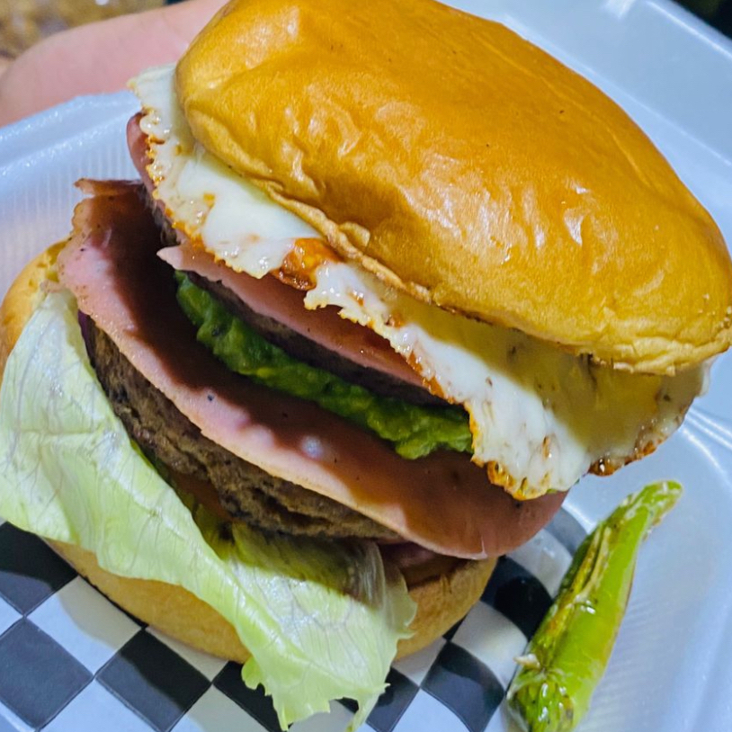 Doble carne 100% arrachera, doble jamón, doble queso americano, tocino, salsa de chipotle, mayonesa y guacamole todo dentro de un pan brioche