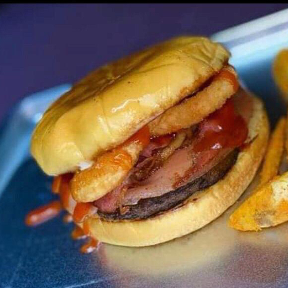 Carne 100% arrachera, jamón, queso americano, tocino, aros de cebolla, BBQ, mayonesa todo adentro de un pan brioche