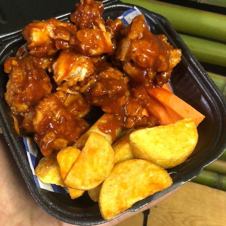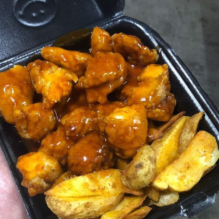 12-14 Piezas de boneless bañado o naturales incluye ranch y sus papas corte gajo
