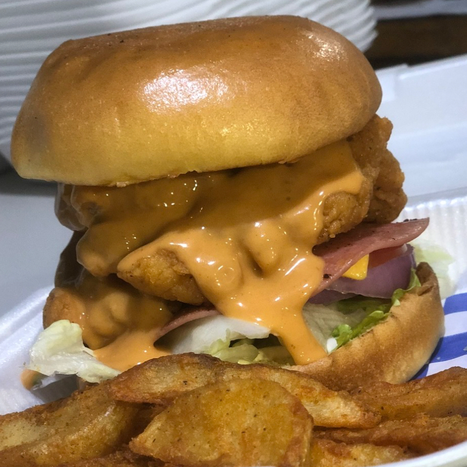 Carne 100% arrachera, tender de pollo bañado en chipotle, jamón, queso americano, lechuga, tomate, cebolla morada, mayonesa y pan brioche