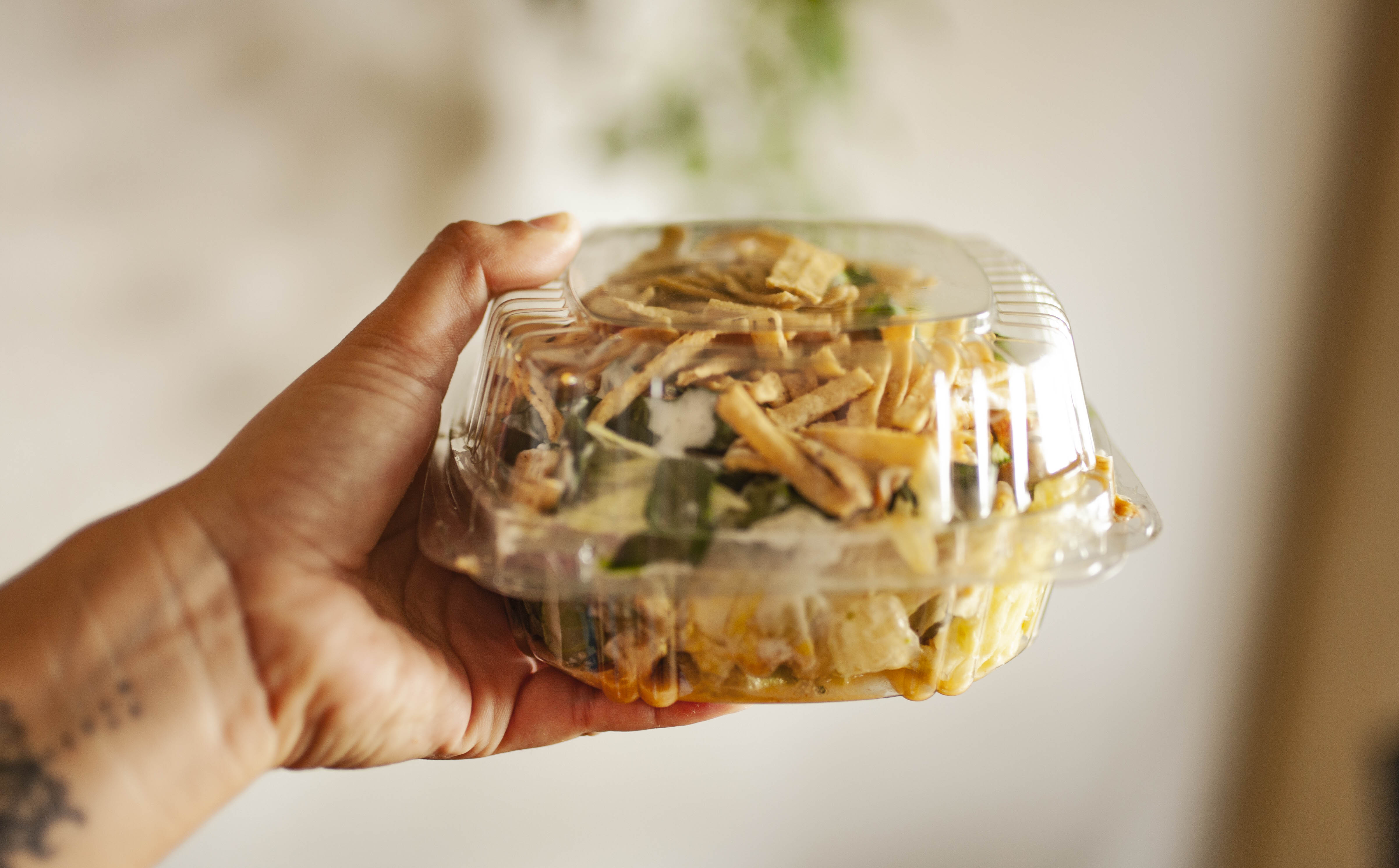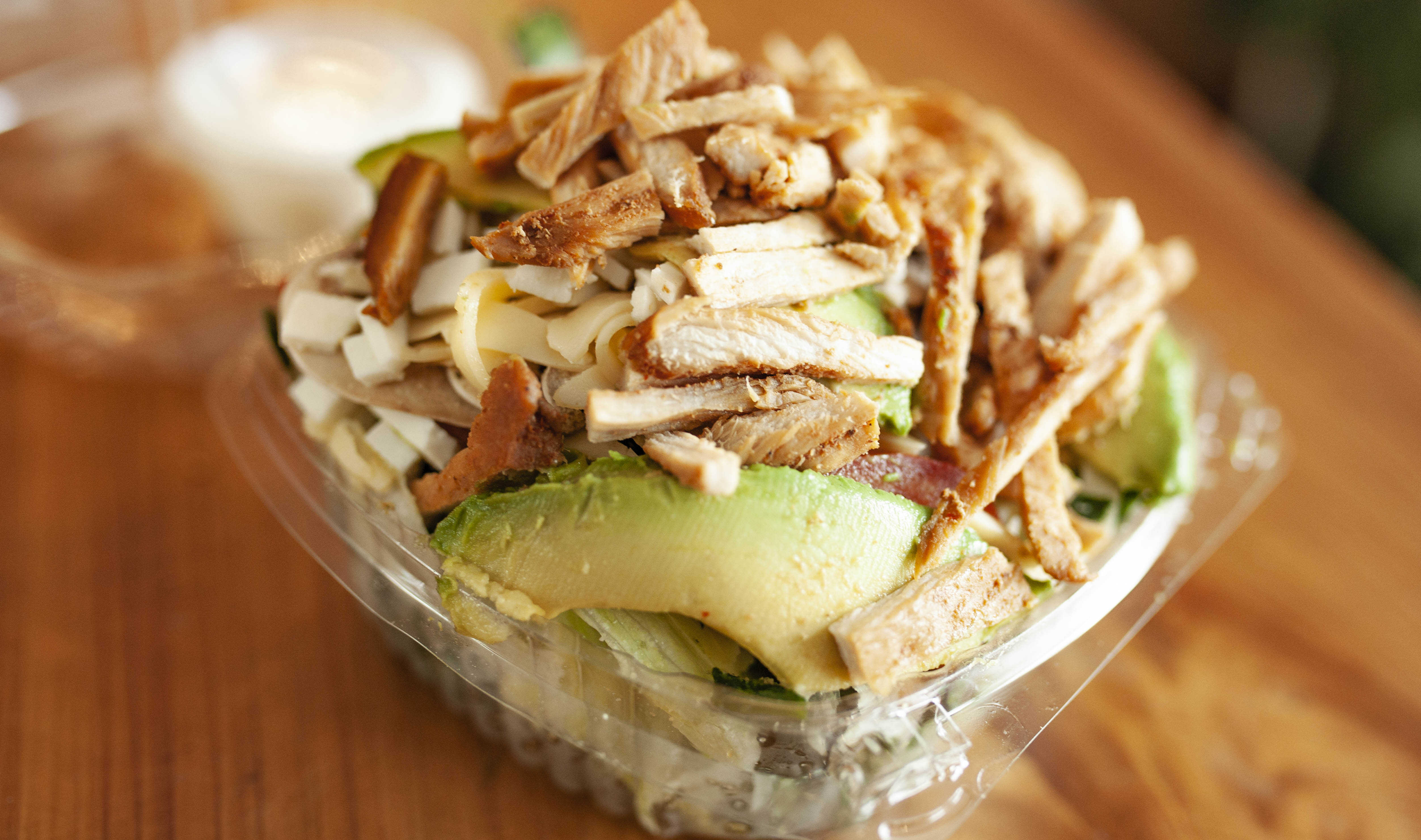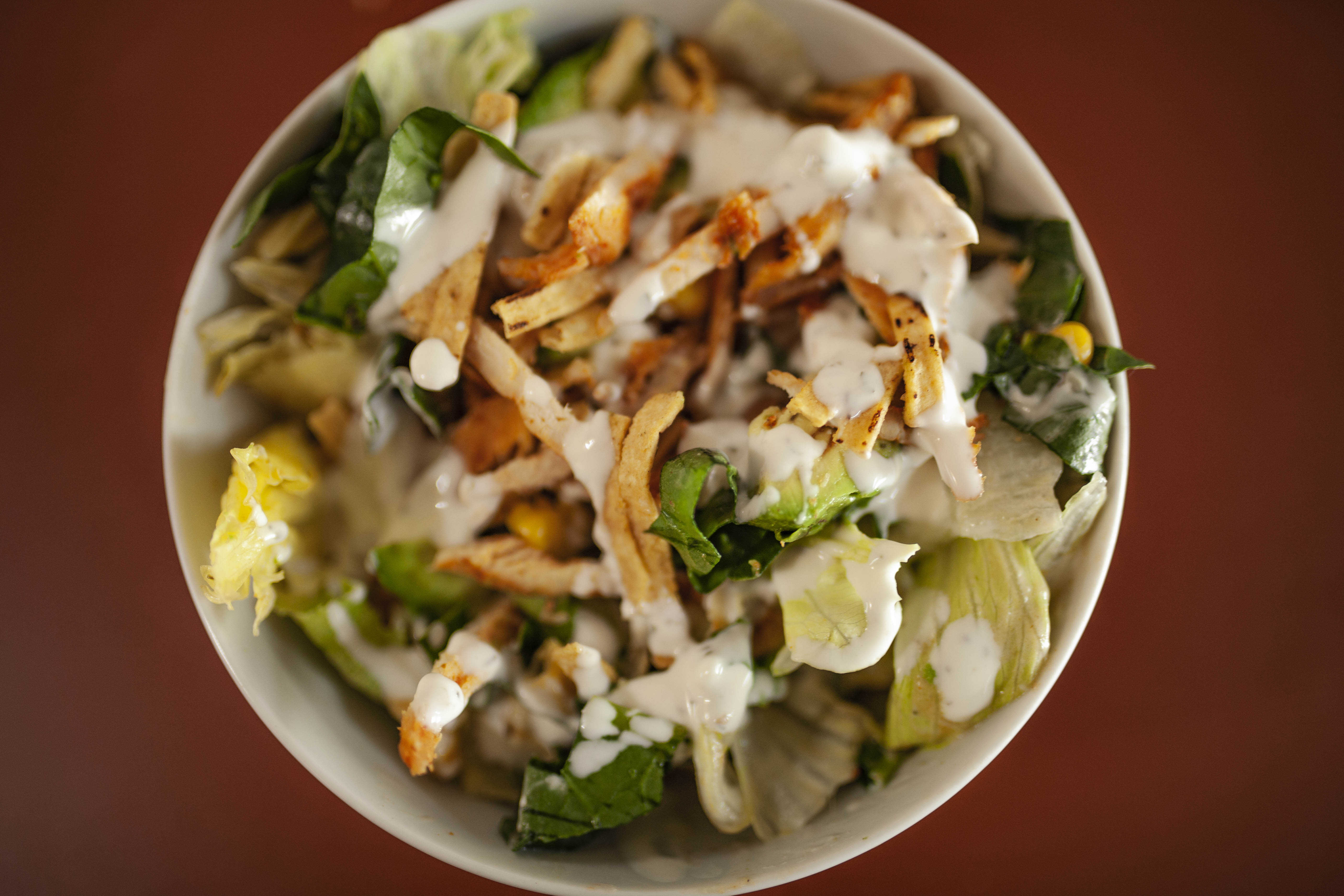 Lechuga, queso gouda, pechuga de pollo, frijol ranch, aguacate, semillas de girasol, tiritas de tortilla fritas y crema.