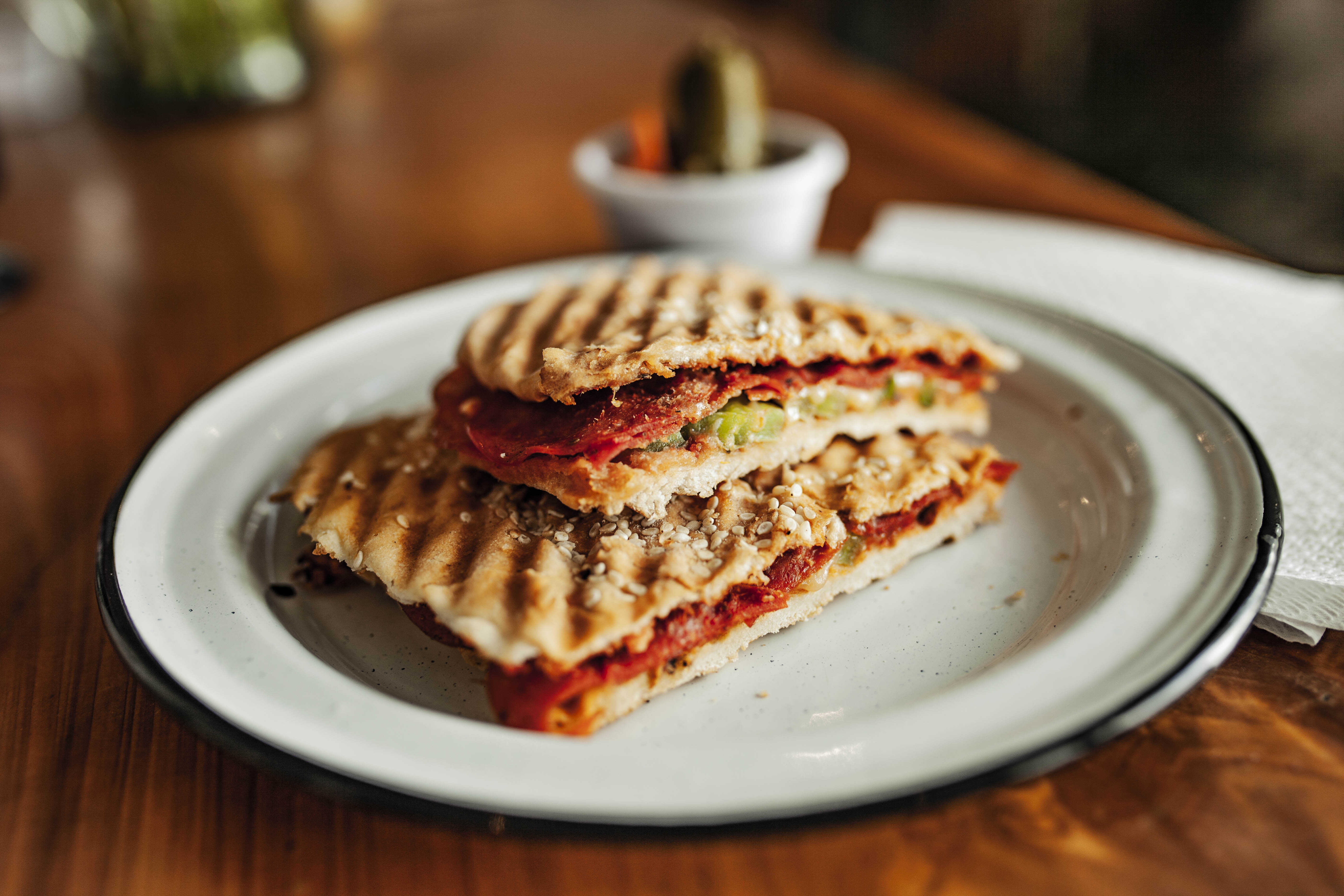 Panini de pepperoni con pimiento verde, queso gouda y salsa de tomate condimentada con finas hierbas.