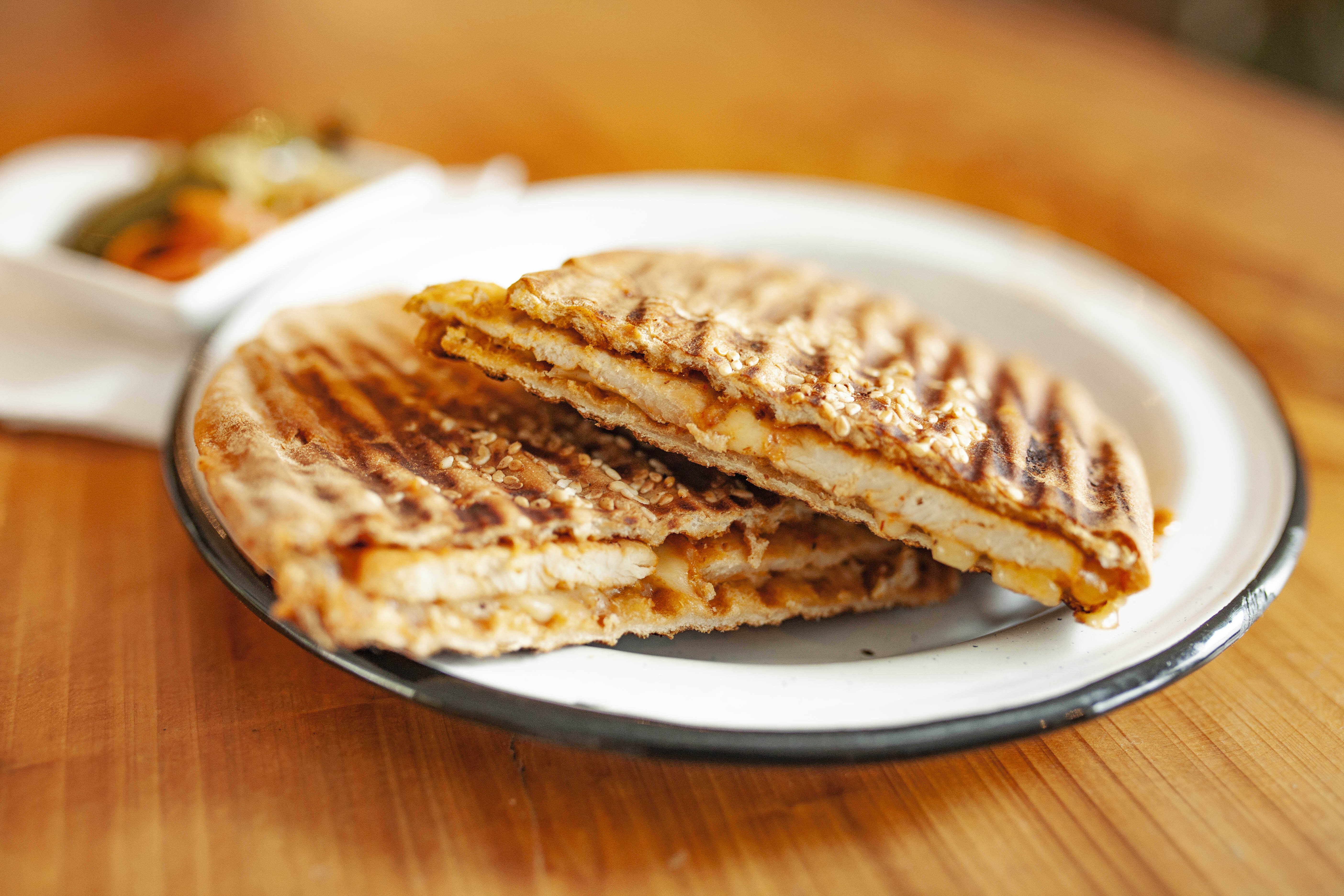 Panini vegetariano con champiñones, pimiento verde, espinacas, queso gouda, queso panela, aceite de oliva extra virgen con especias italianas y salsa de tomate.