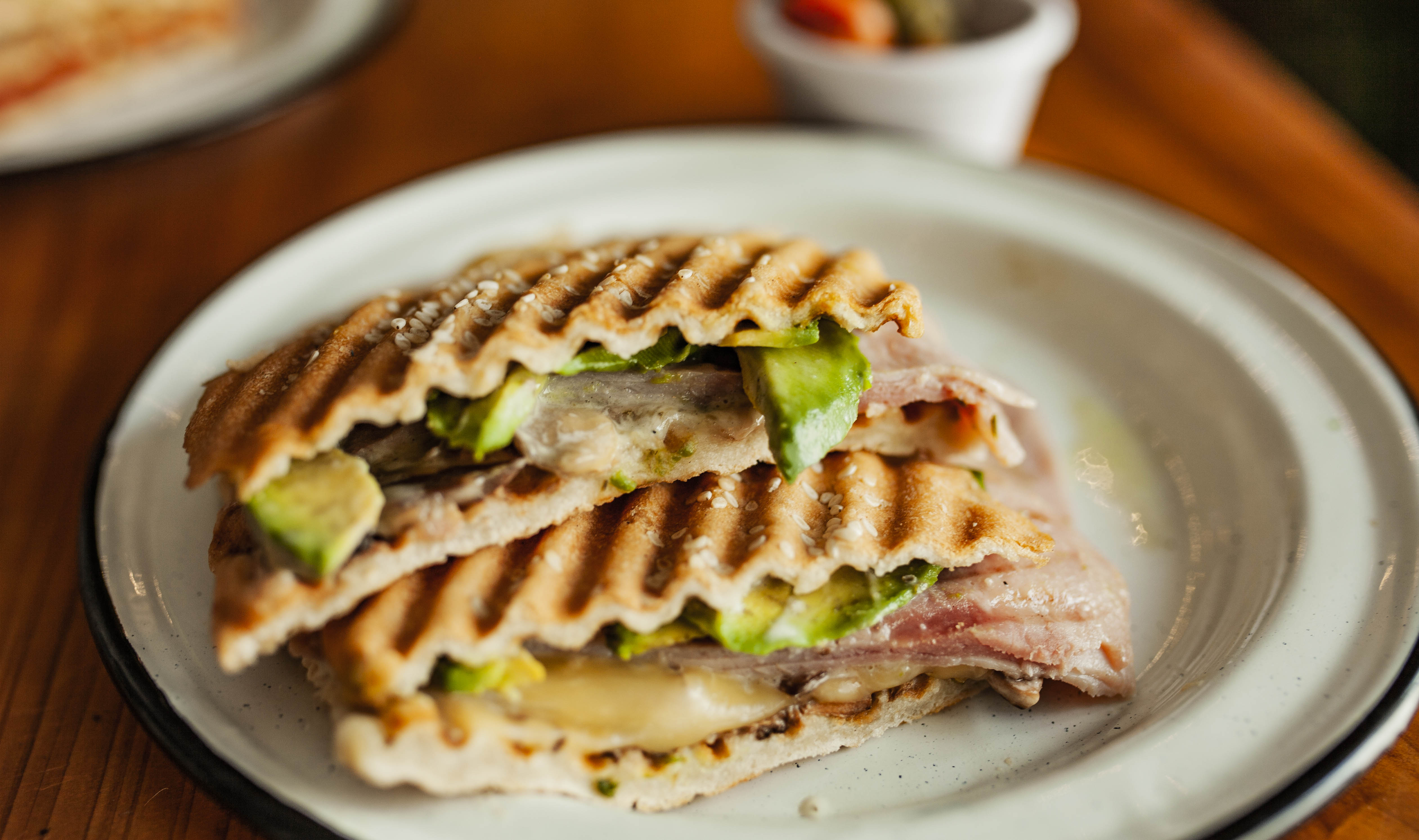 Panini de jamón de pavo ahumado, champiñones, queso gouda, aguacate y salsa cremosa con especies italianas.