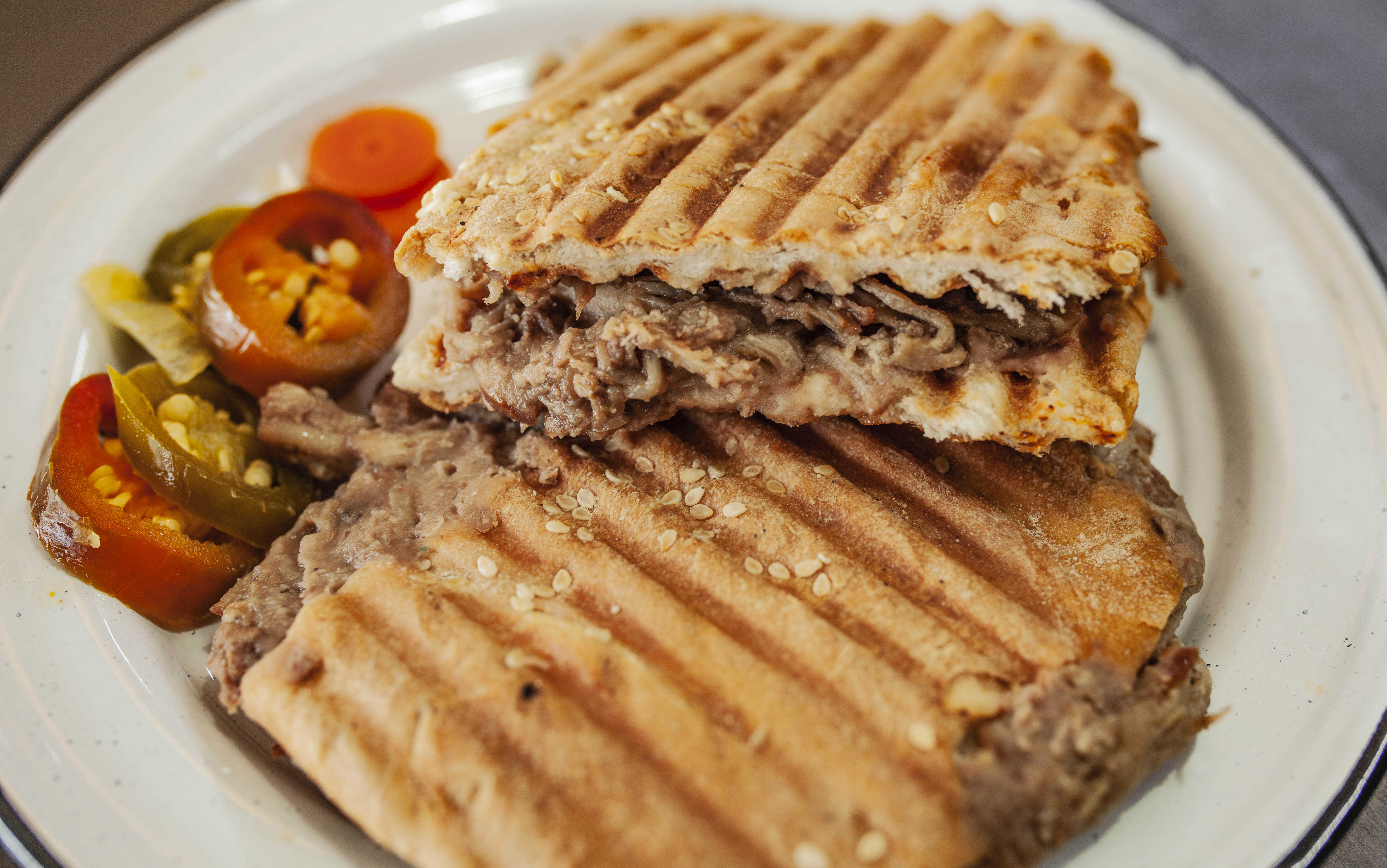 Torta de pierna horneada de puerco frijoles refritos, cebolla, chipotle y aguacate.