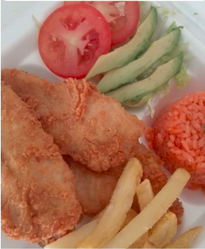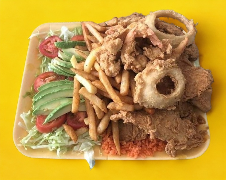 11 piezas de filete, 7 camarones empanizados, 3 aros de cebolla, 3 tostadas de ceviche, arroz, ensaladas, papas, pepsi de litro y medio