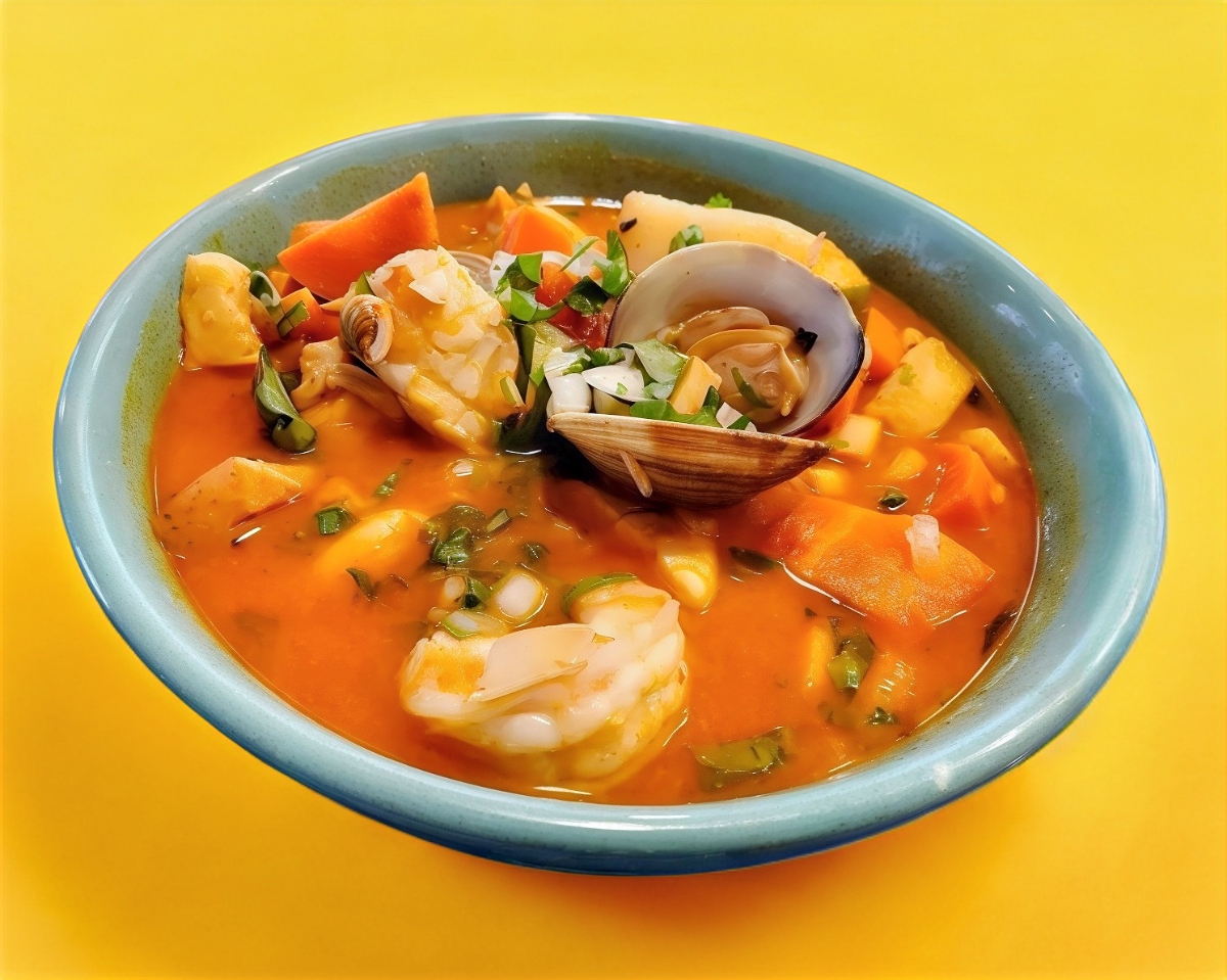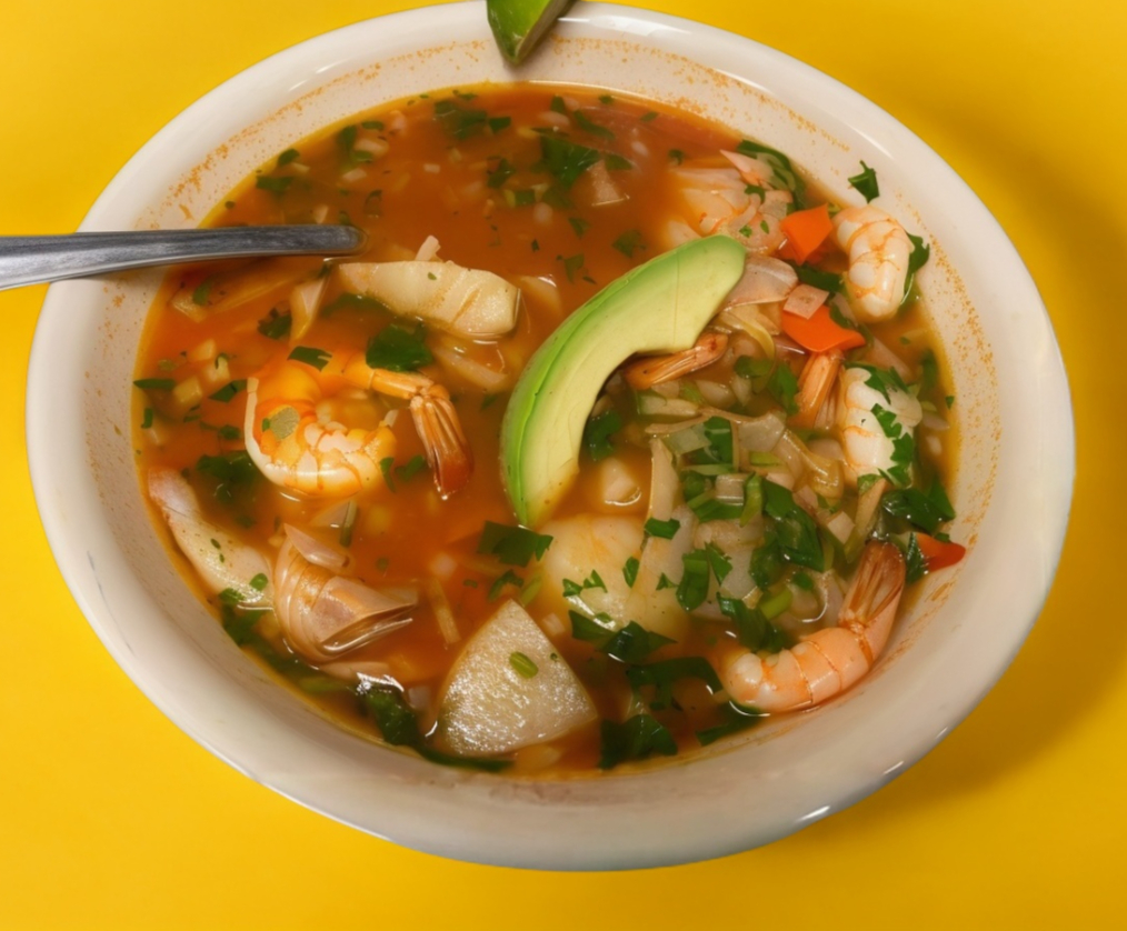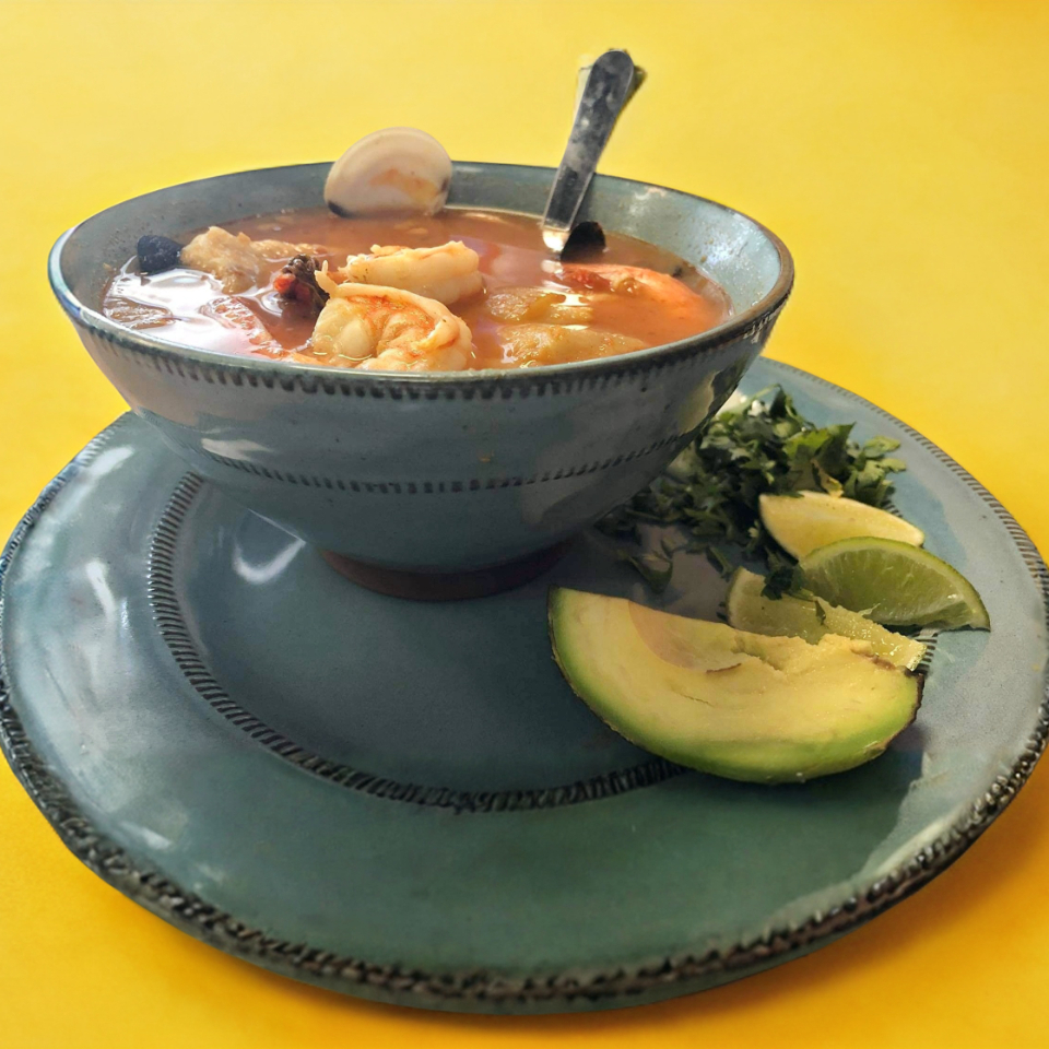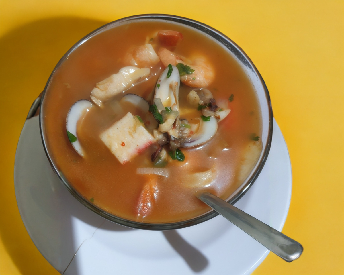 Disfruta de una rica y calientita sopa de mariscos 1LT, incluye porcion de arroz, salsas y aderezo.