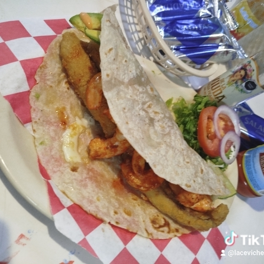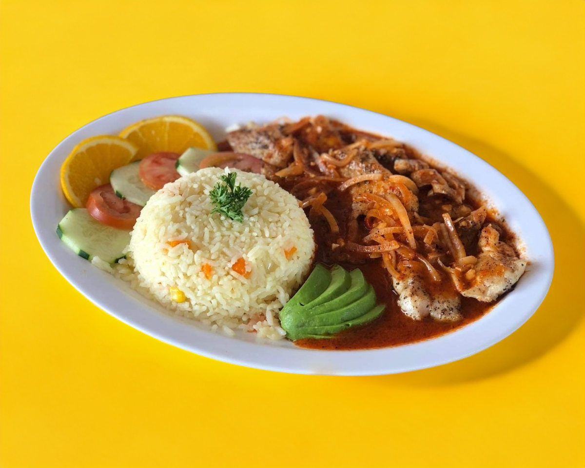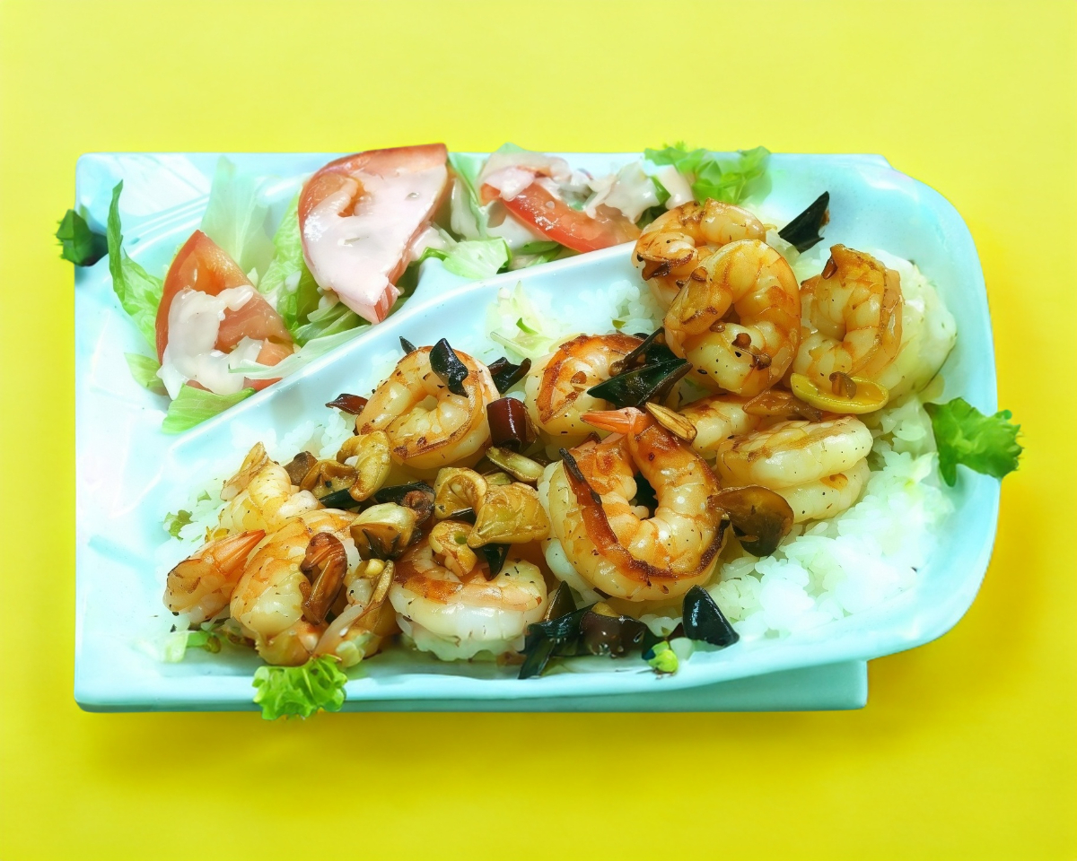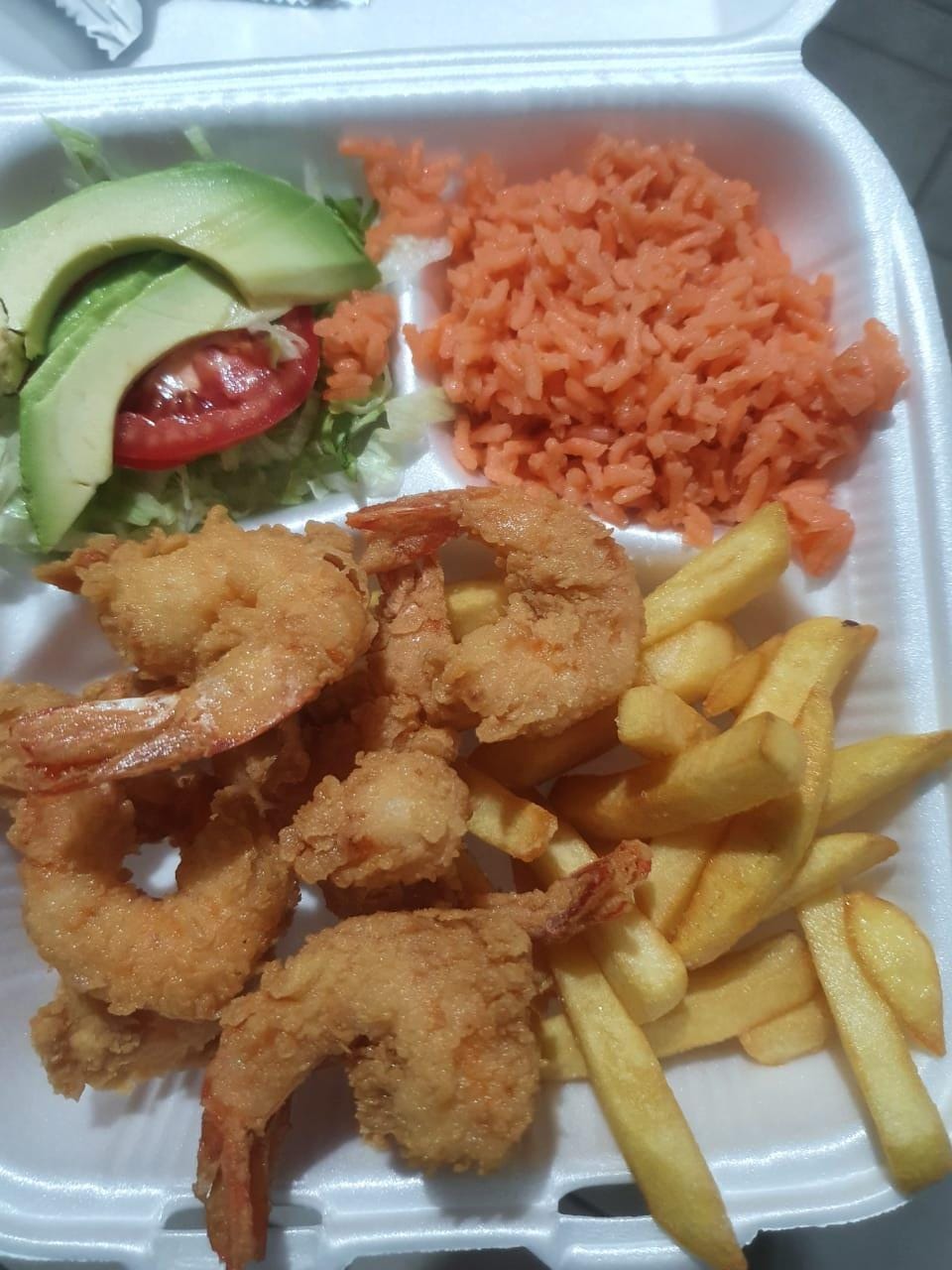 camaron con pescado 1LT, incluye porcion de arroz, galletas, salsas y aderezo.