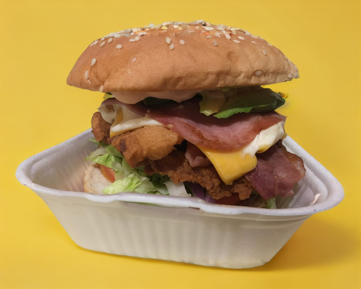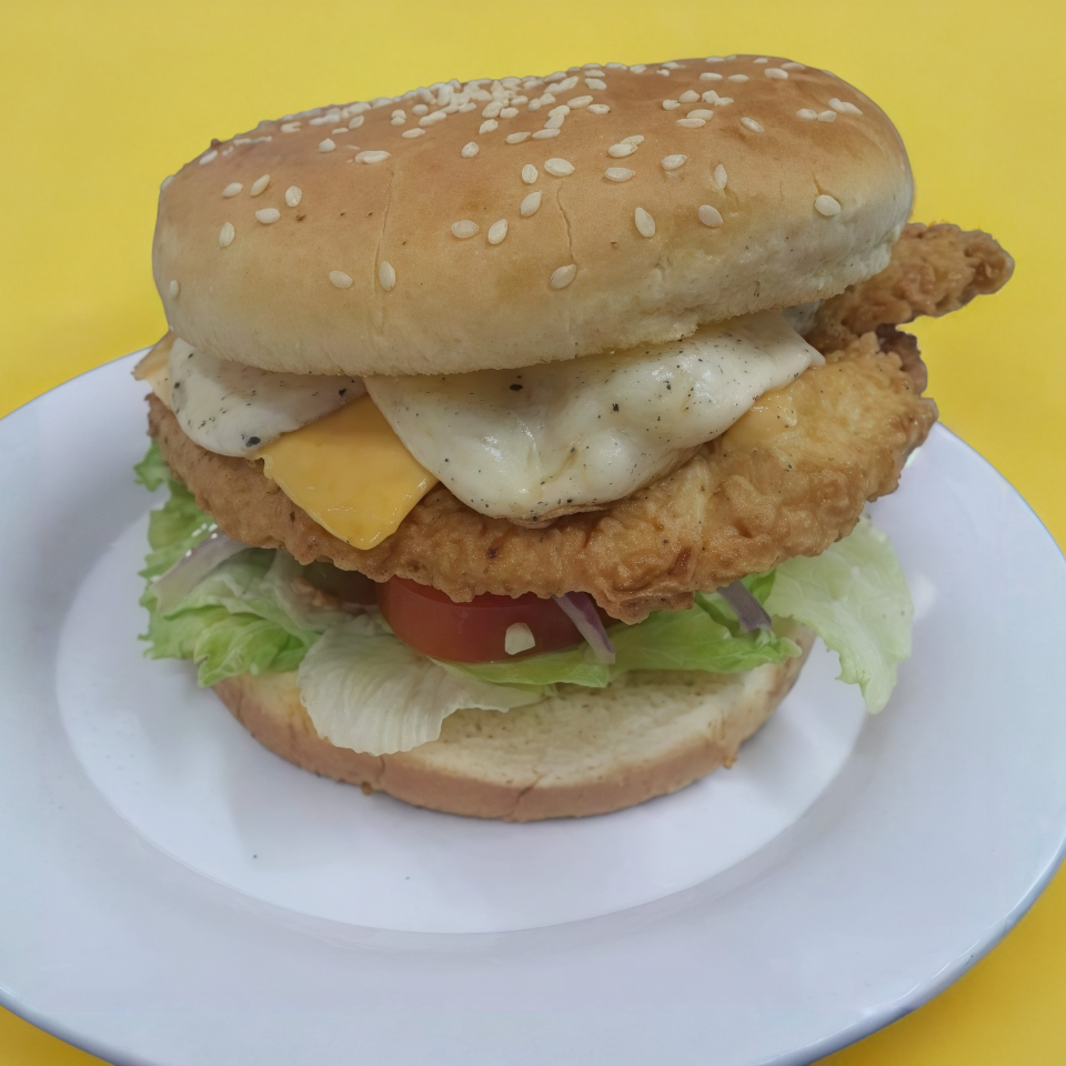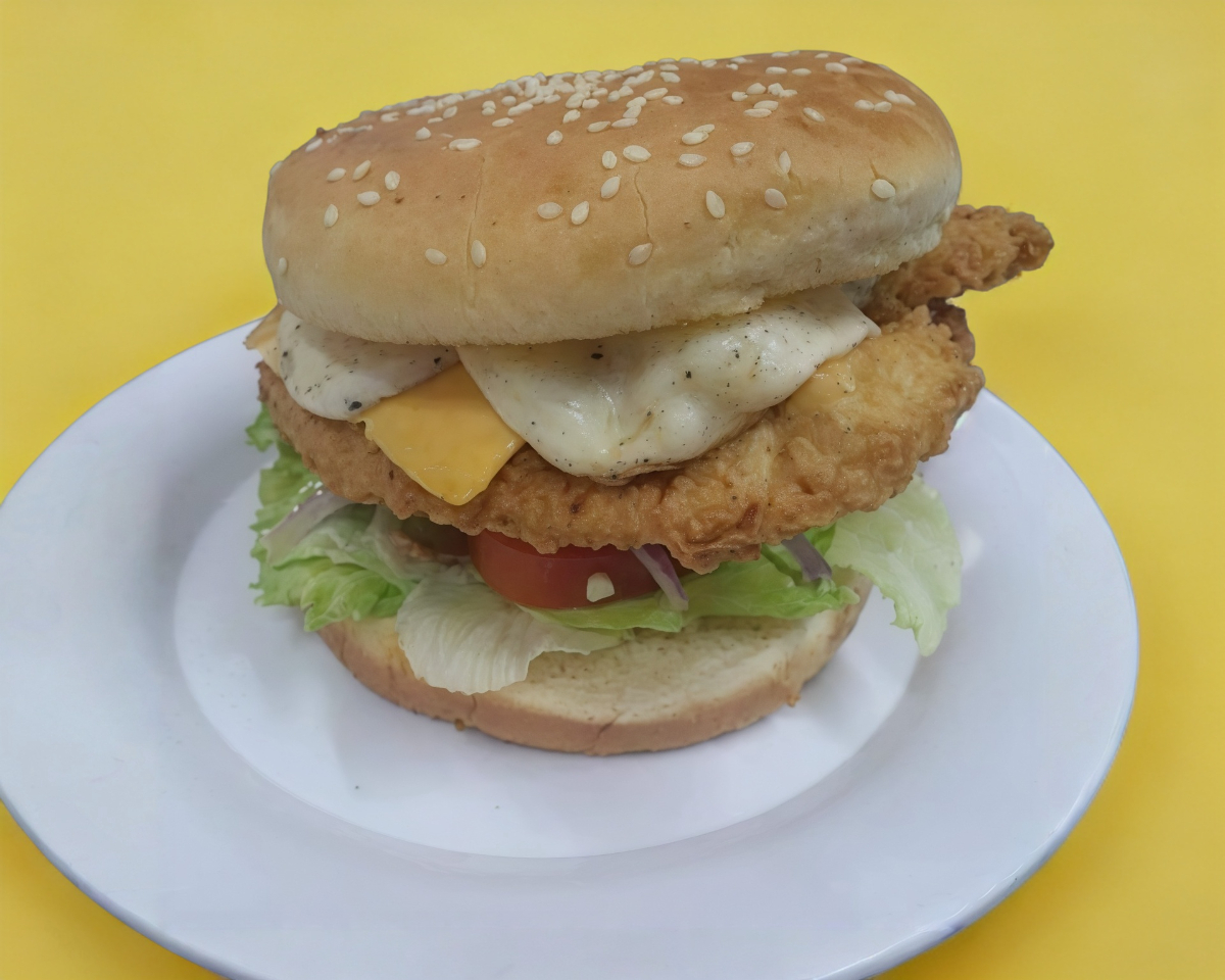 Deliciosa Burguer de Pollo, con vegetales frescos, aderezos e incluye porcion con papas a la francesa fritas.