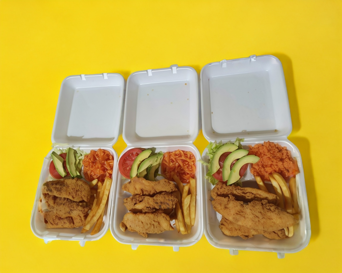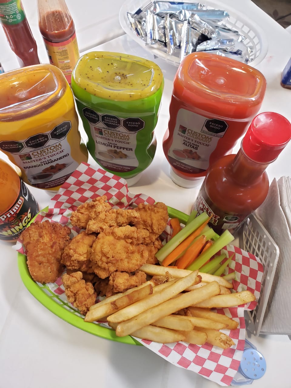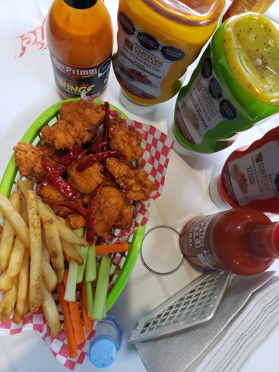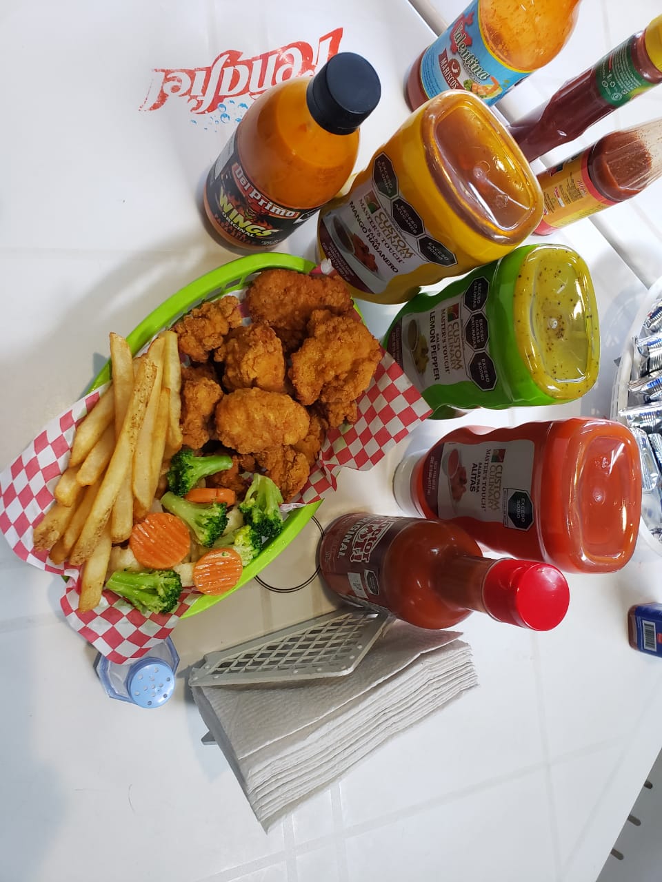 6PZ de pechuga de pollo, elige tu salsa favorita. Incluye papas fritas y aderezo ranch.