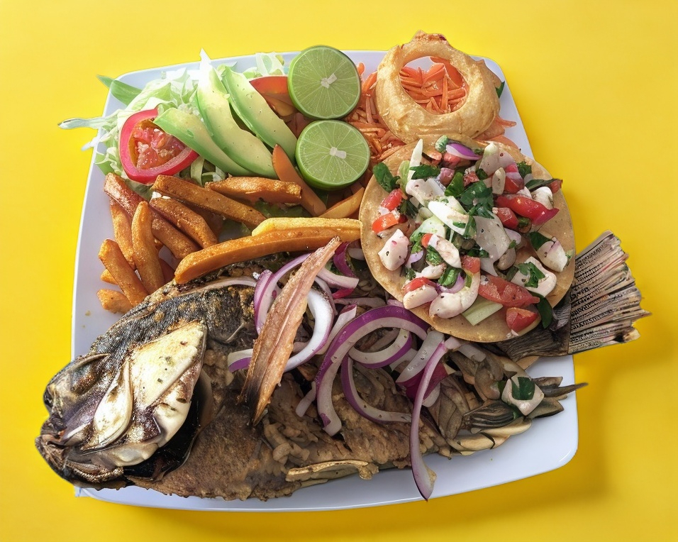 Mojara Especial, incluye porcion de Arroz, ensalada, papas a la francesa y 1 tostada de ceviche.
