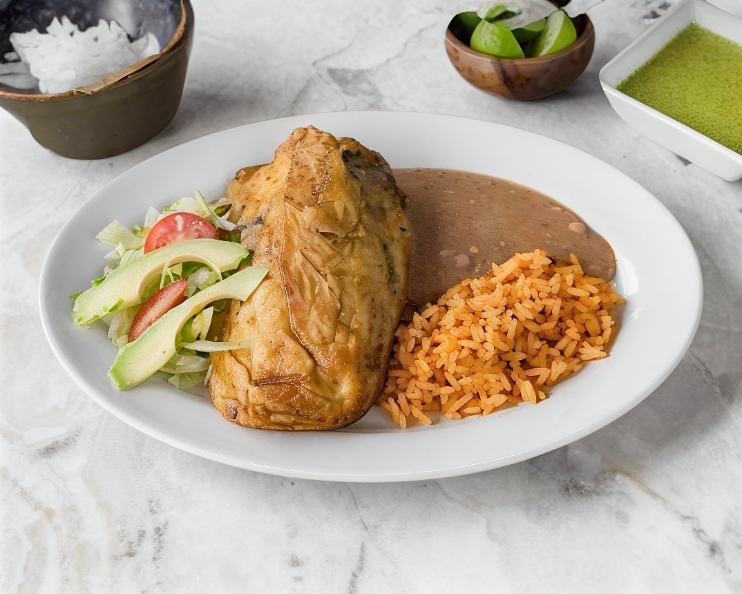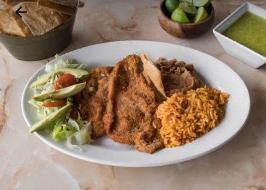 Platillo personal, Milanesa empanizada Res ó Pollo(80 gramos), acompañada de arroz(100 gramos), frijoles ,ensalada de lechuga, tomate y aguacate en rebanadas